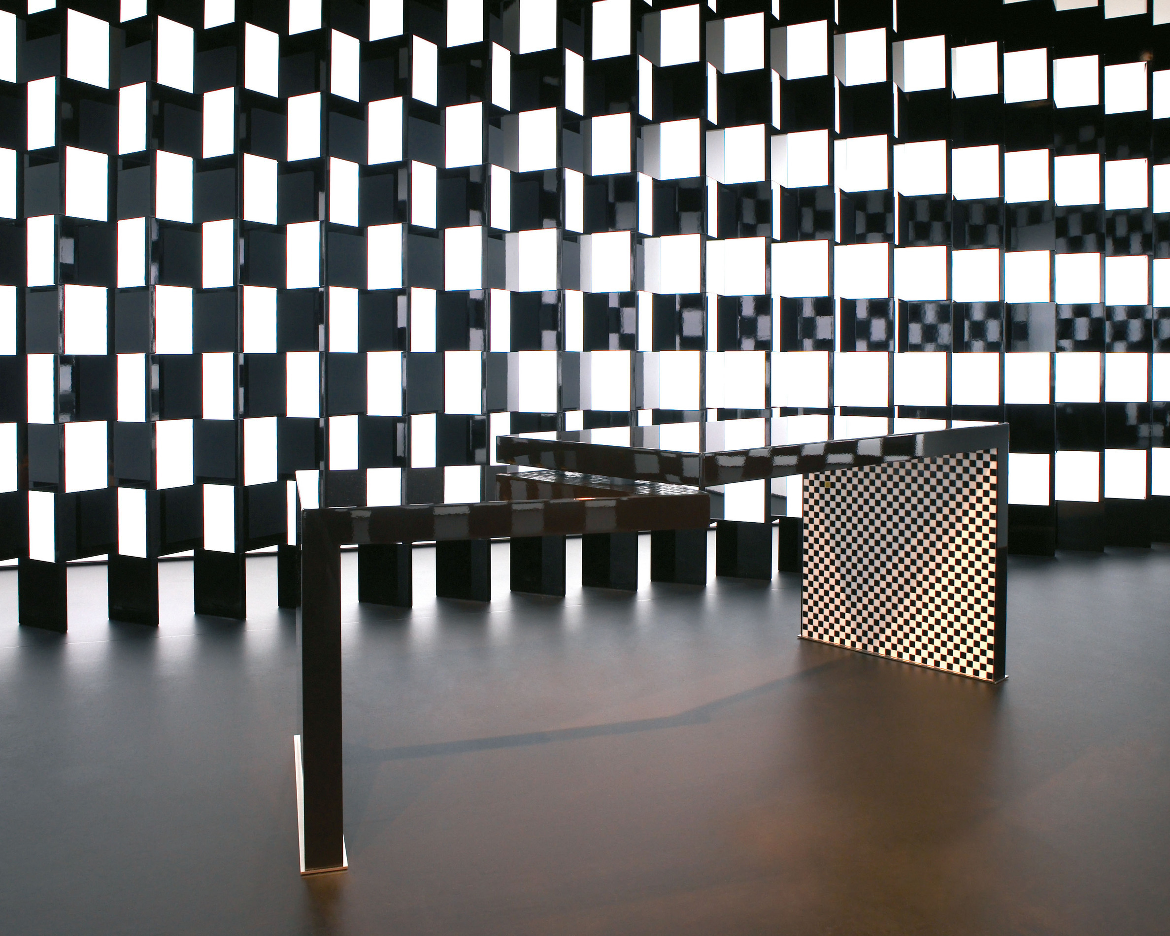 In 2008, at the Salone del Mobile in Milan, the Entrevue collection for Bisazza, designed by Andrée Putman, revealed a composed aesthetic, where mosaic tiles become a graphic element in their own right. Among the standout pieces, the Correspondances desk juxtaposes lacquered surfaces with contrasting mosaic patterns, punctuated by a gilded tile, introducing a subtle visual play to a rigorous form.