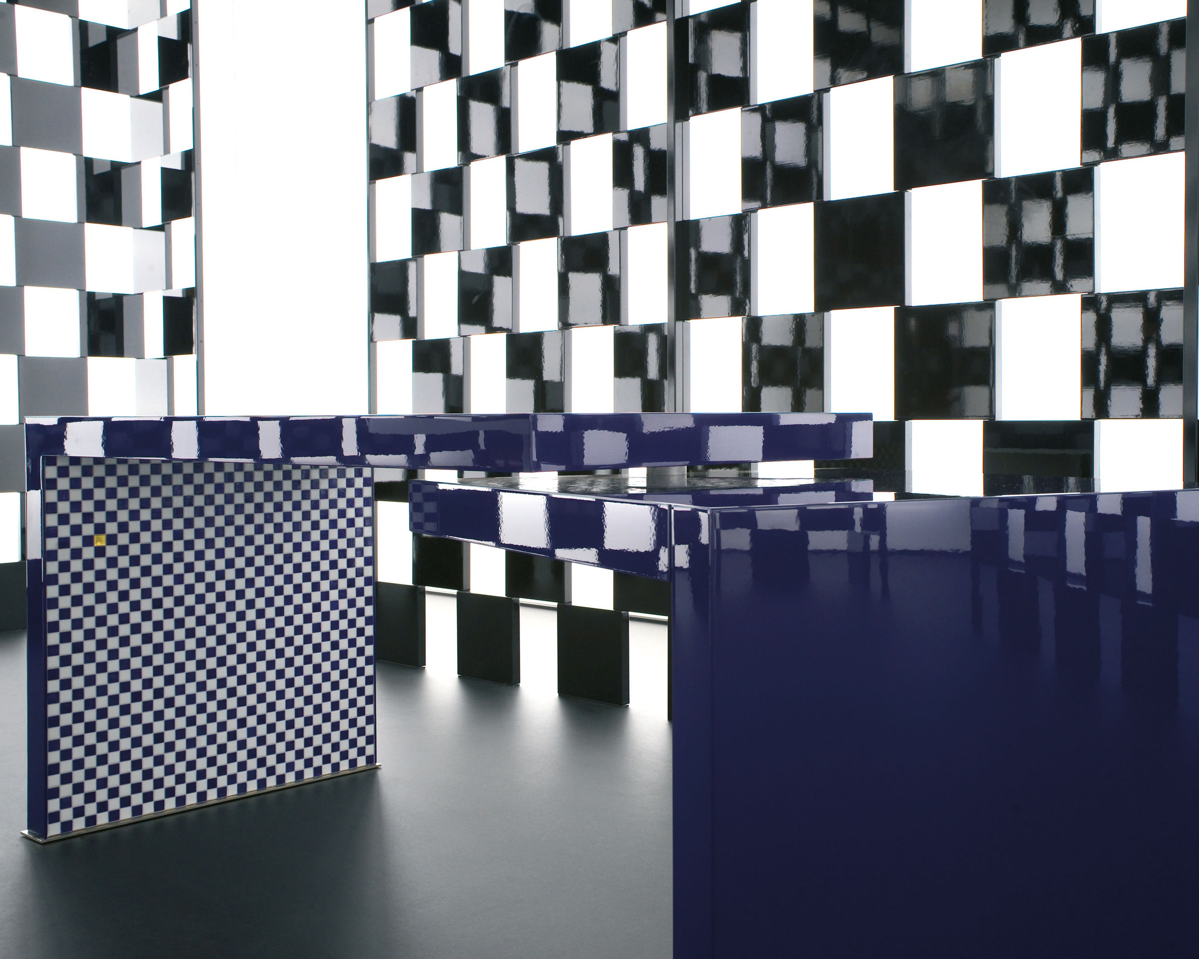 The scenography presented at Superstudio Più highlighted this edition as a modular work: overlapping surfaces, chromatic variations, and a dialogue between texture and light. Entrevue demonstrates how Putman explored mosaic not only as ornamentation but as a structural and decorative language.