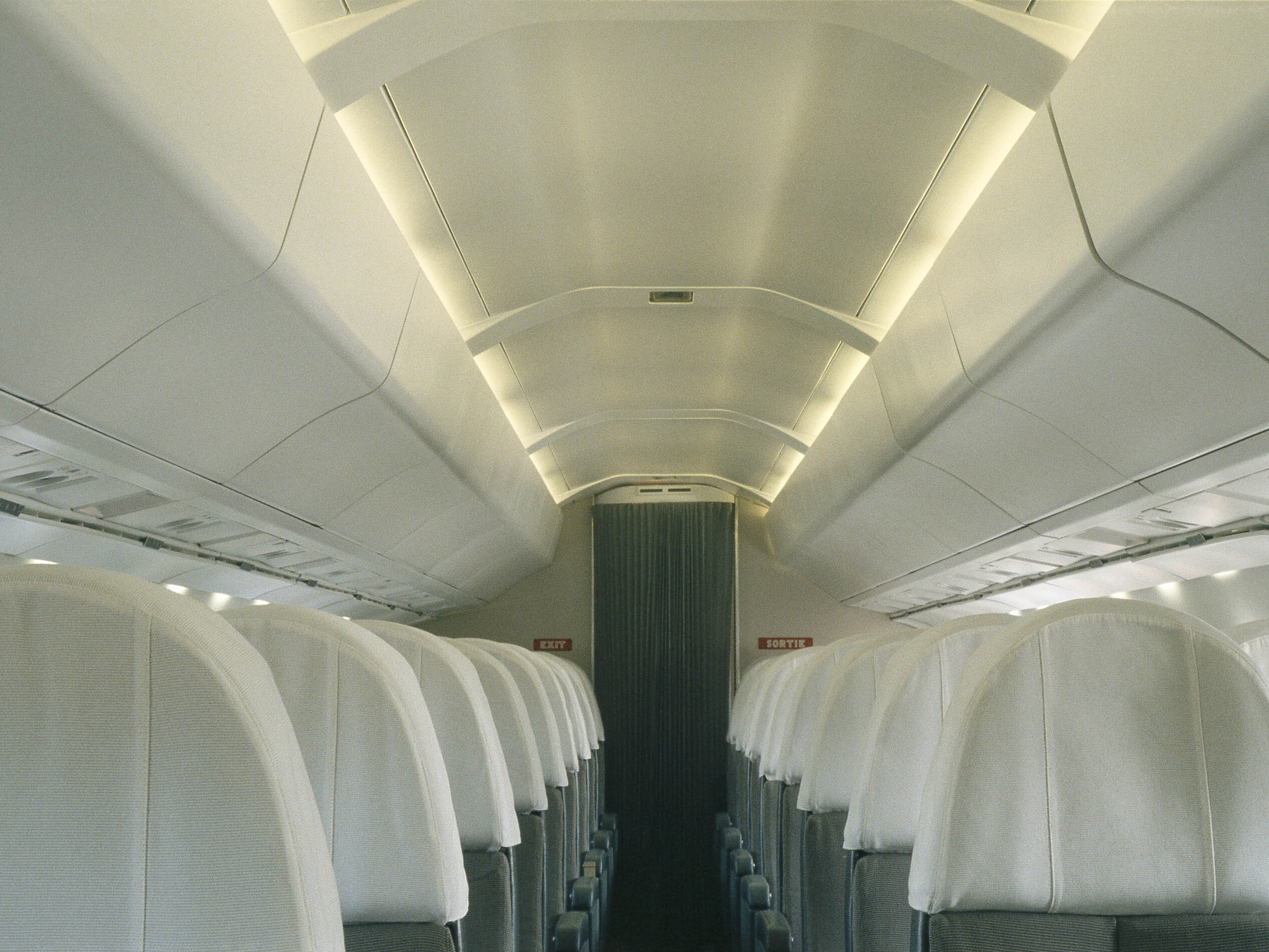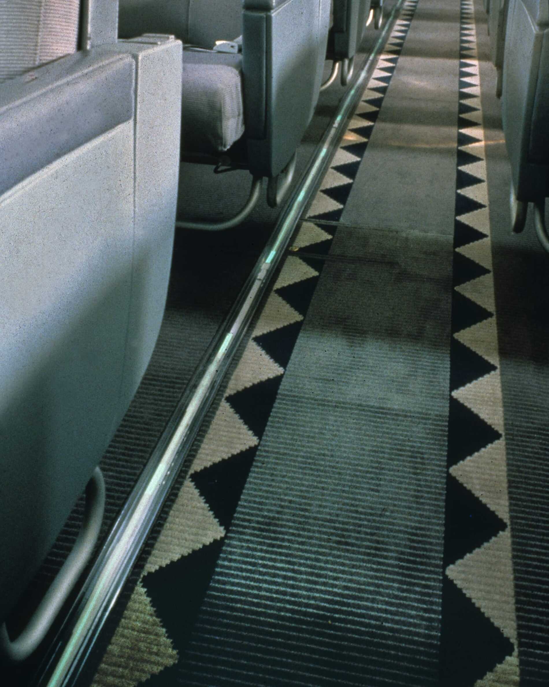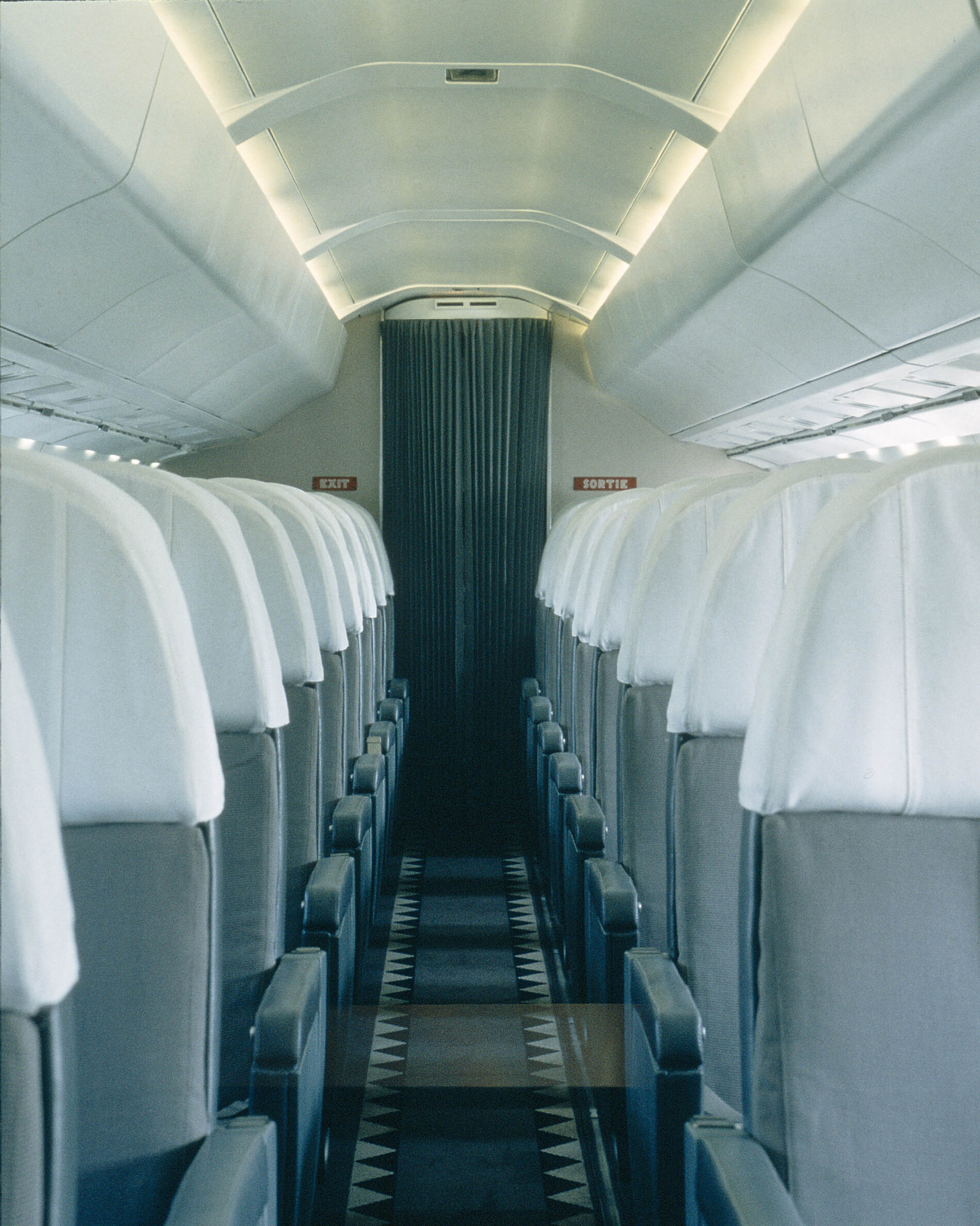 In the 1990s, Andrée Putman was commissioned by Air France to redesign the interior of the Concorde, the ultimate symbol of supersonic travel. She set out to modernize the space with rigor and elegance, removing any decorative excess to prioritize clarity, fluidity, and comfort. The aisle was covered with a discreet carpet bordered by a black-and-beige triangular frieze, while the seats, upholstered in pearl gray fabric, were topped with white piqué headrests.