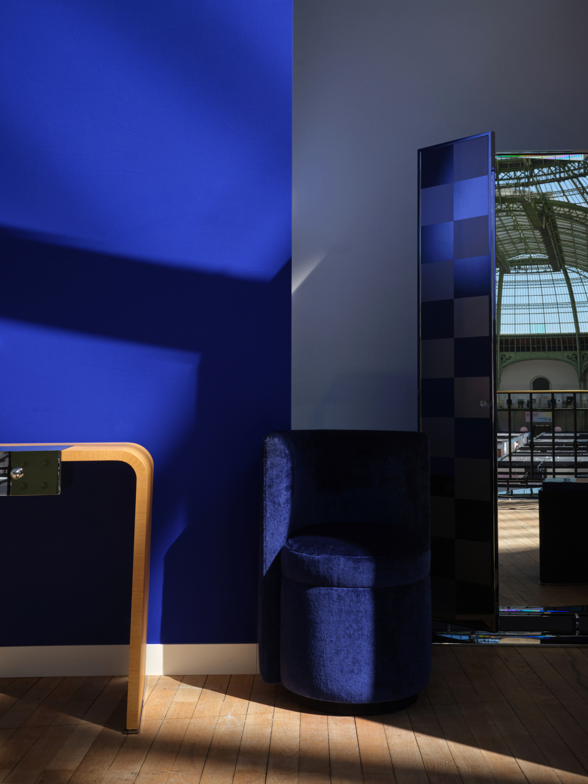 The Agenda de Ministre armchair combines a solid cylindrical seat with a pronounced vertical backrest, shaping a refined and resolutely architectural silhouette. Clad in mohair velvet and set on a swivel base, it asserts a strong graphic presence. Its black-stained oak base further reinforces its structured character.