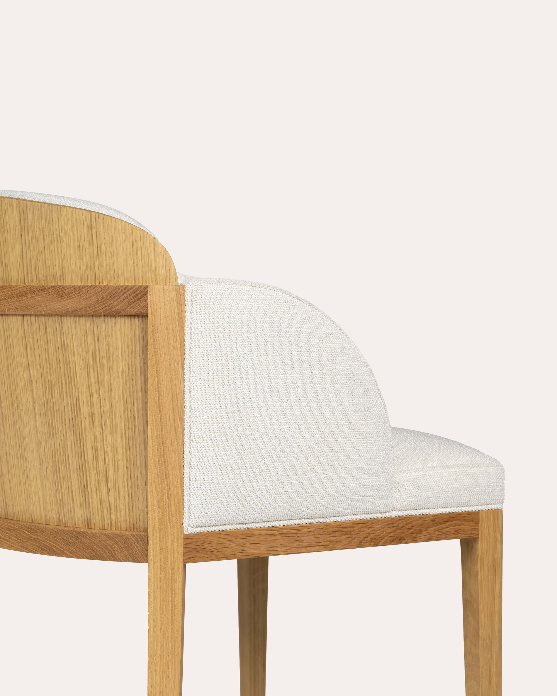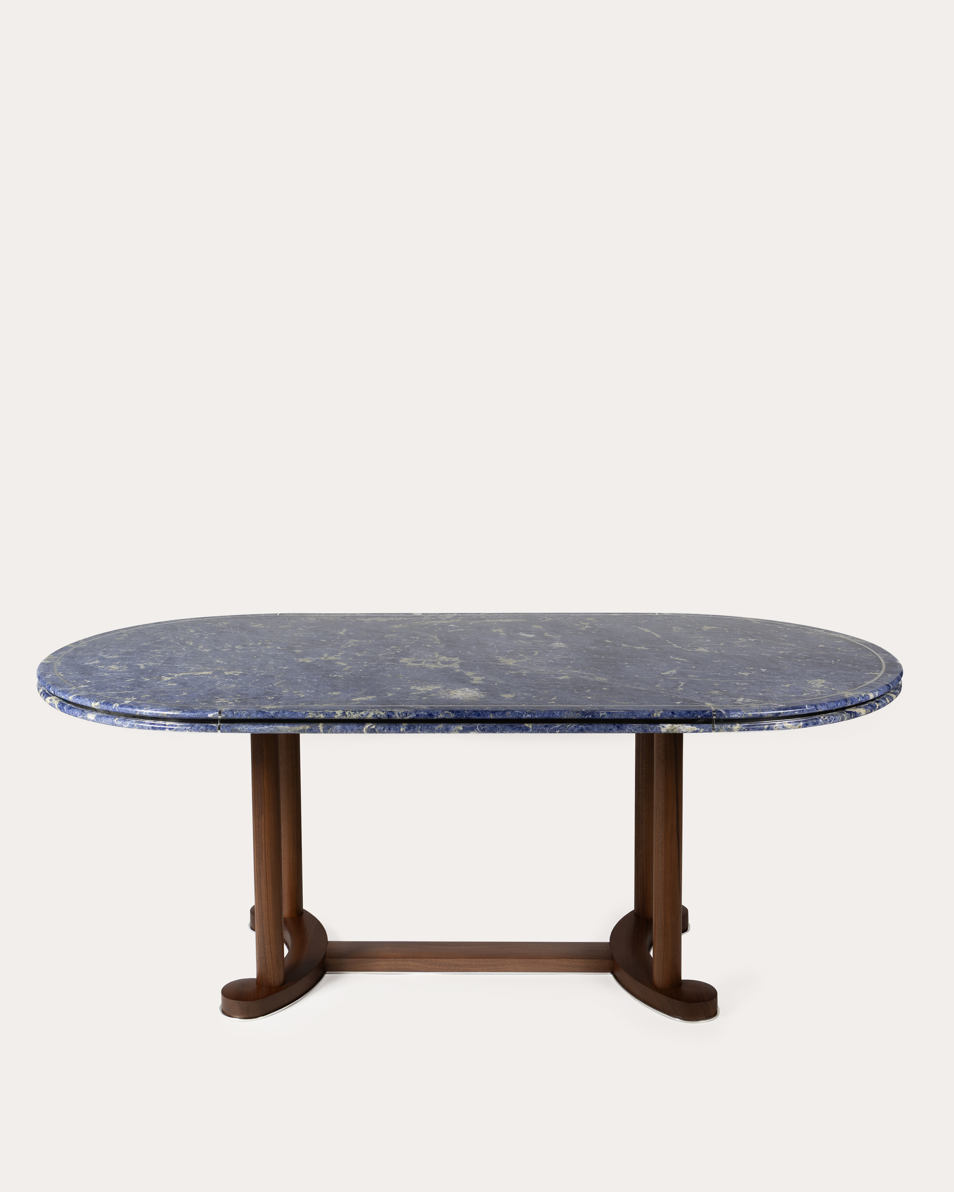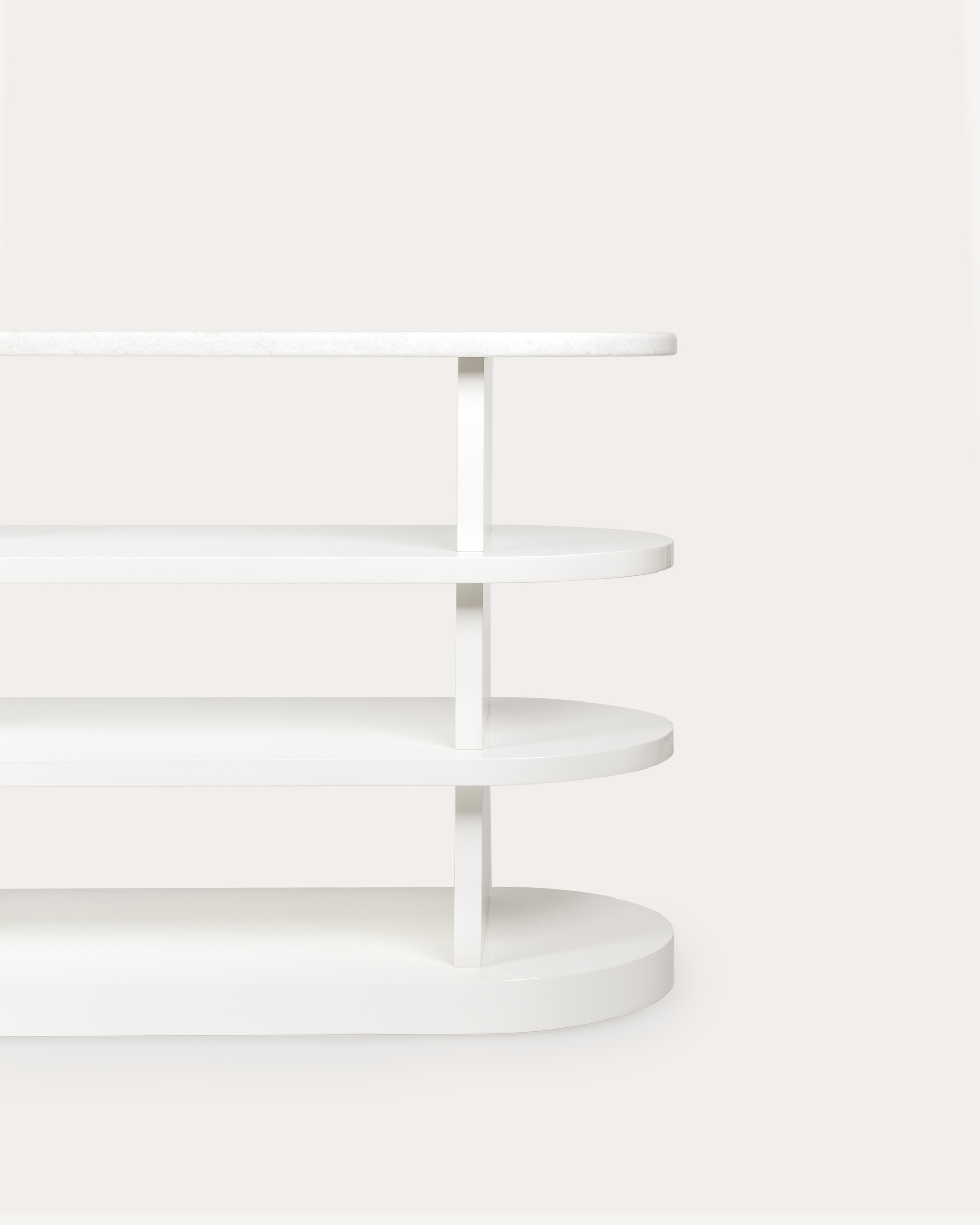 The Trois Regards console builds its design around elliptical shelves in white lacquered wood, supported by precise vertical lines. Topped with Naxos marble, it plays with contrasts between gloss and mineral texture. Its balanced proportions and refined architecture allow it to find its place naturally in any interior.