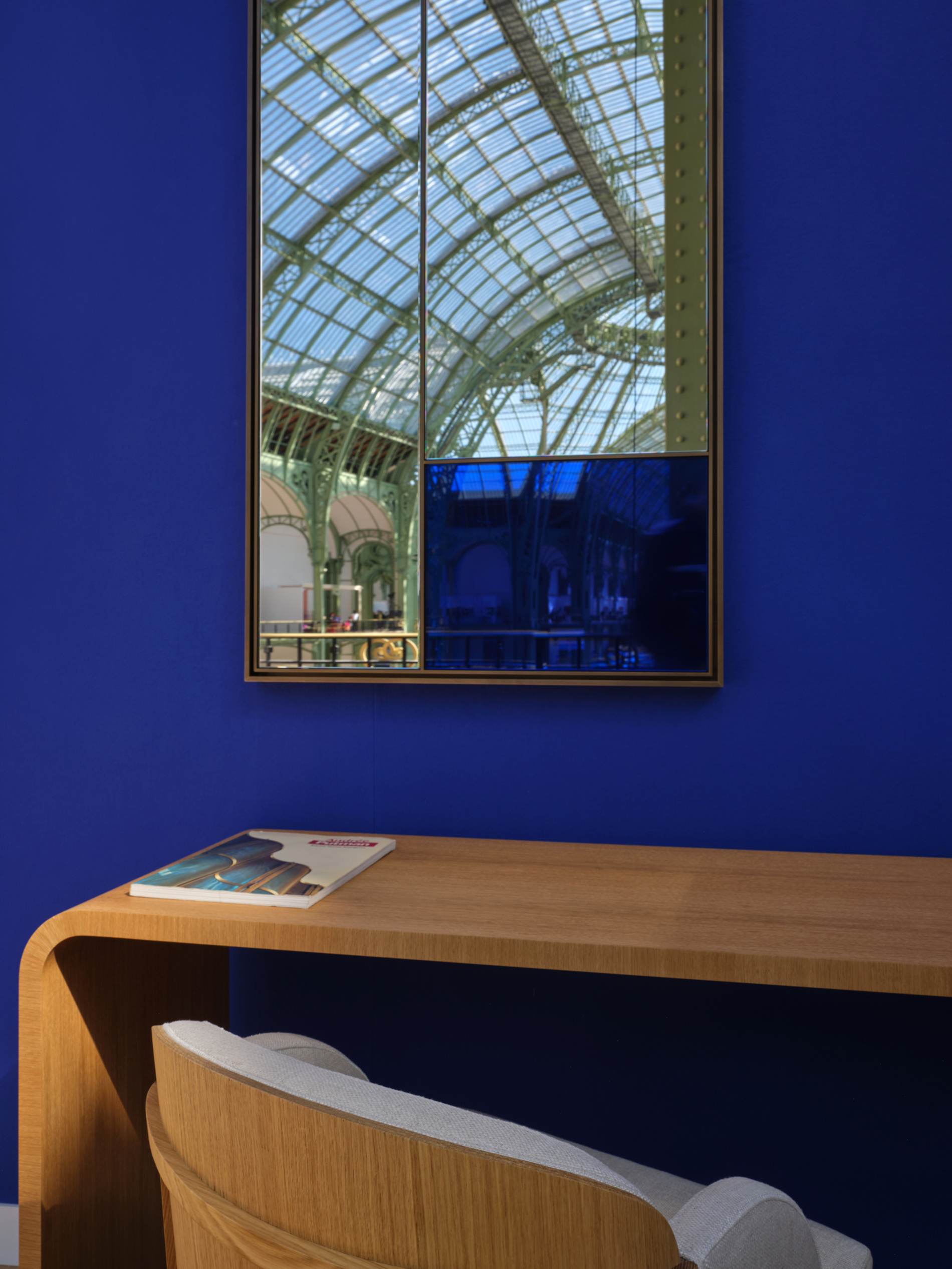 The Double Je mirror is conceived as a geometric composition in which two surfaces — clear mirror and blue-tinted mirror — interact in a precise balance. The patinated brass frame structures the piece, while the blue accents introduce a subtle vibrancy that enlivens the whole. A play of forms and reflections that immediately draws the eye.