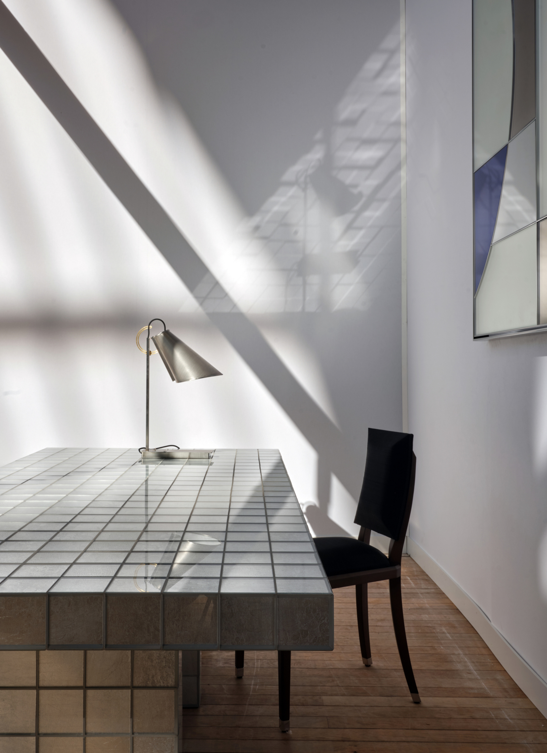 The Compas dans l’œil lighting range is built on a design of great clarity, where simple geometric forms combine with balanced precision. Brushed stainless steel, satin brass and perforated metal mesh create a harmonious silhouette, while the pivoting shade allows the light to be directed with subtle finesse.