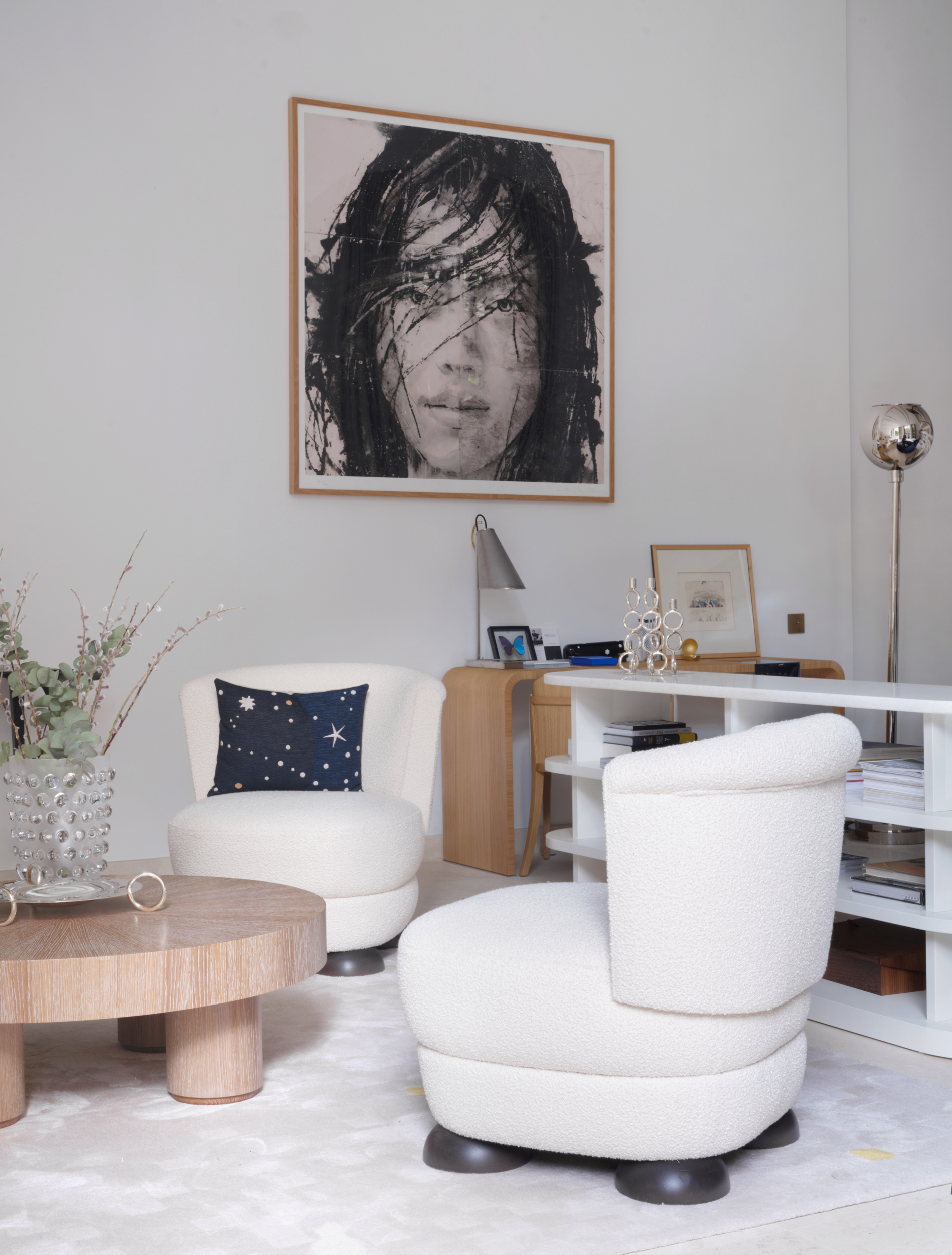 The Jeune Bûcheron coffee table pairs a broad circular top with four cylindrical supports that give it a distinctly sculptural presence. The white-cerused oak veneer unfolds a radiant pattern that lends a gentle luminosity to the surface. A piece where the clarity of the design meets the richness of the material.