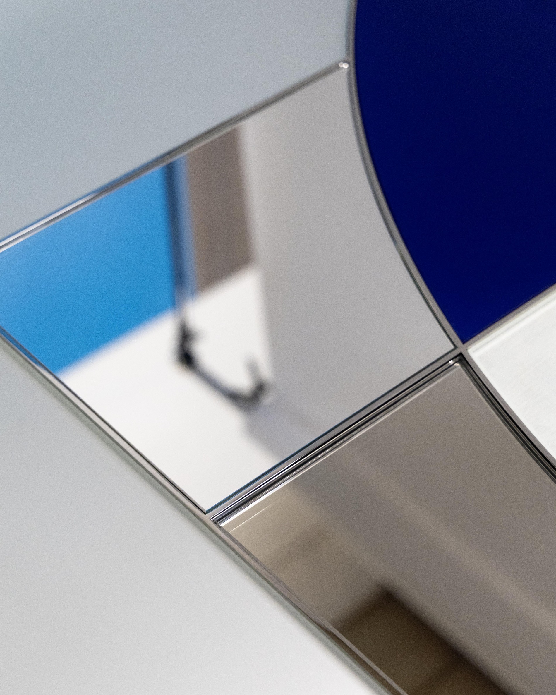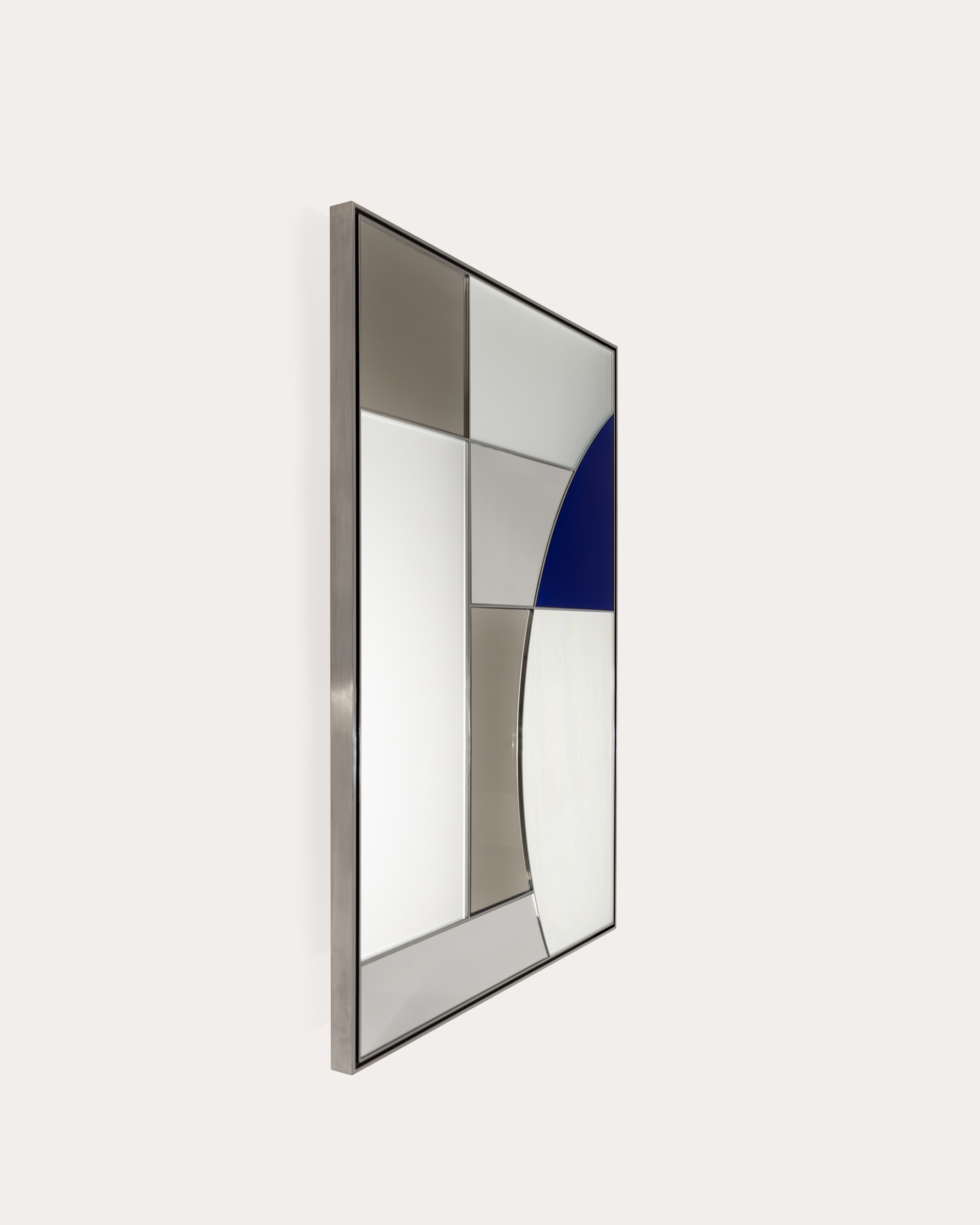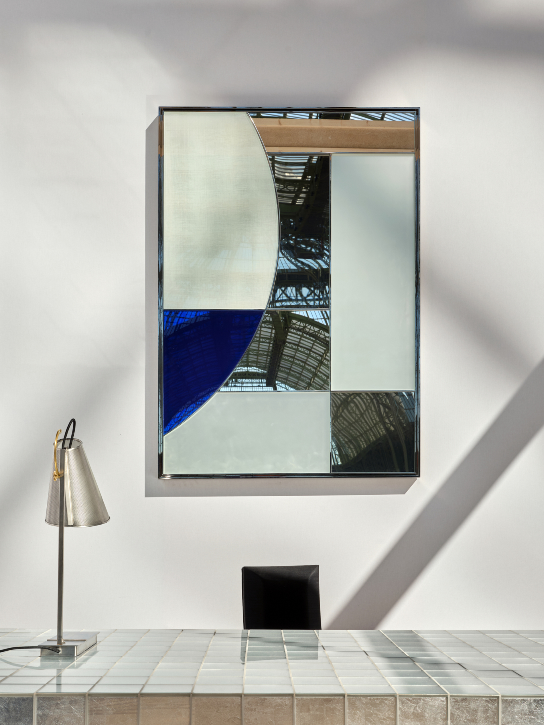 The Reflet Cartésien mirror unfolds a geometry reminiscent of stained glass, where five mirror finishes are assembled within a precise grid. Stainless steel outlines each segment and structures the composition. At a large scale, the piece reveals a richness of reflections and tonalities, offering a graphic presence paired with genuine visual depth.