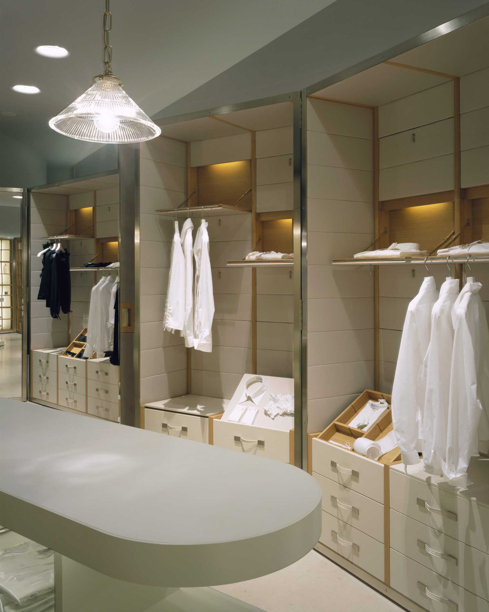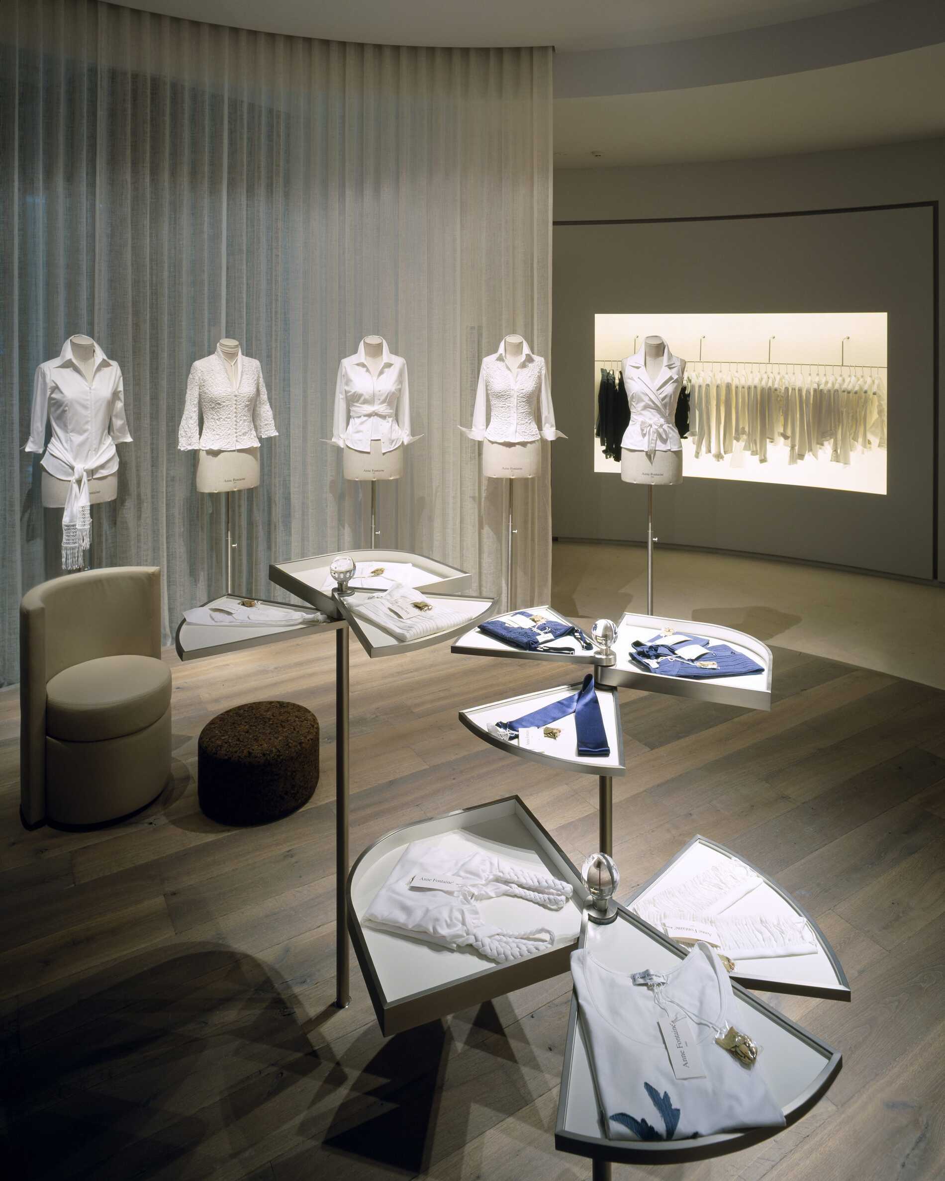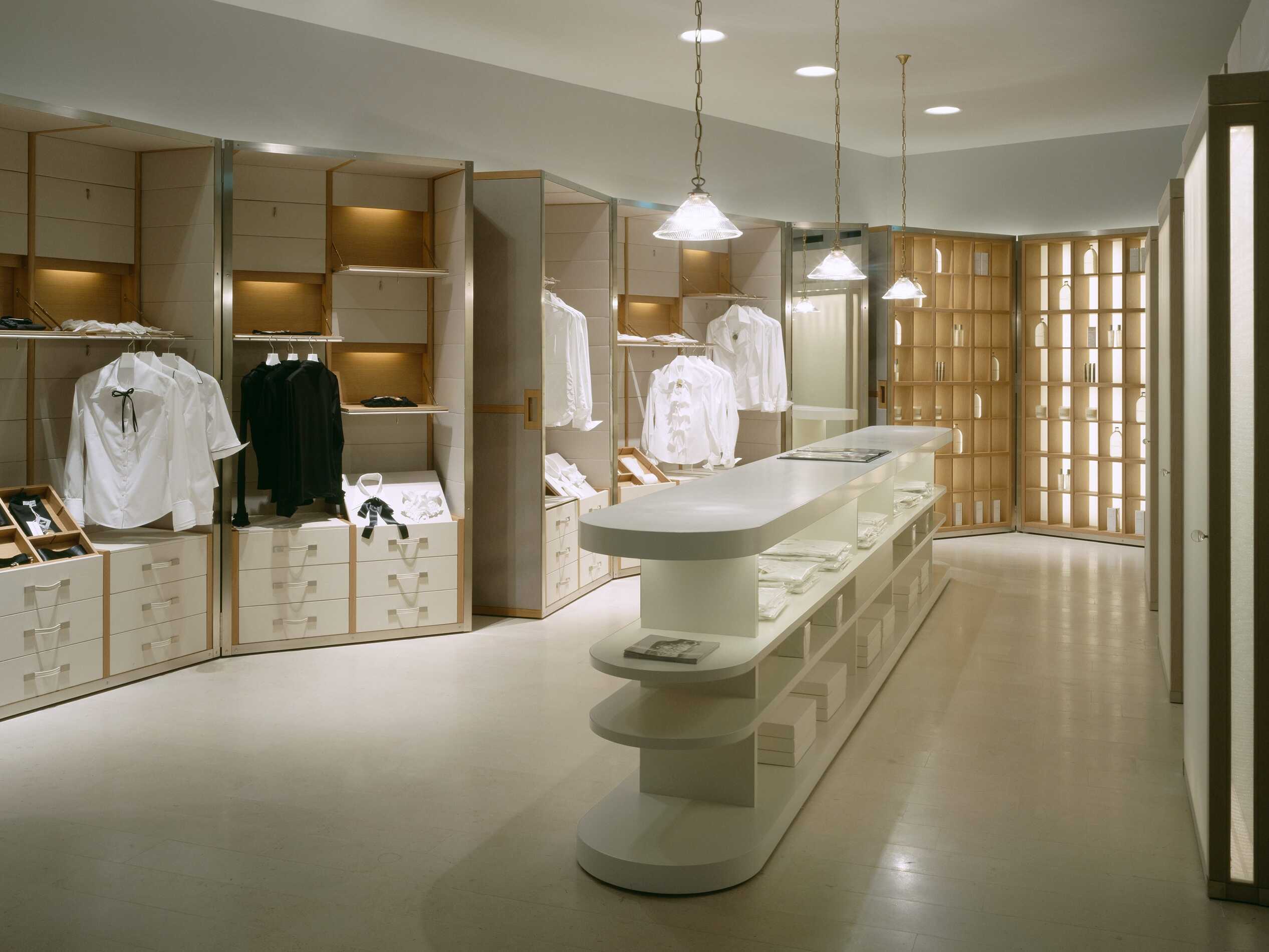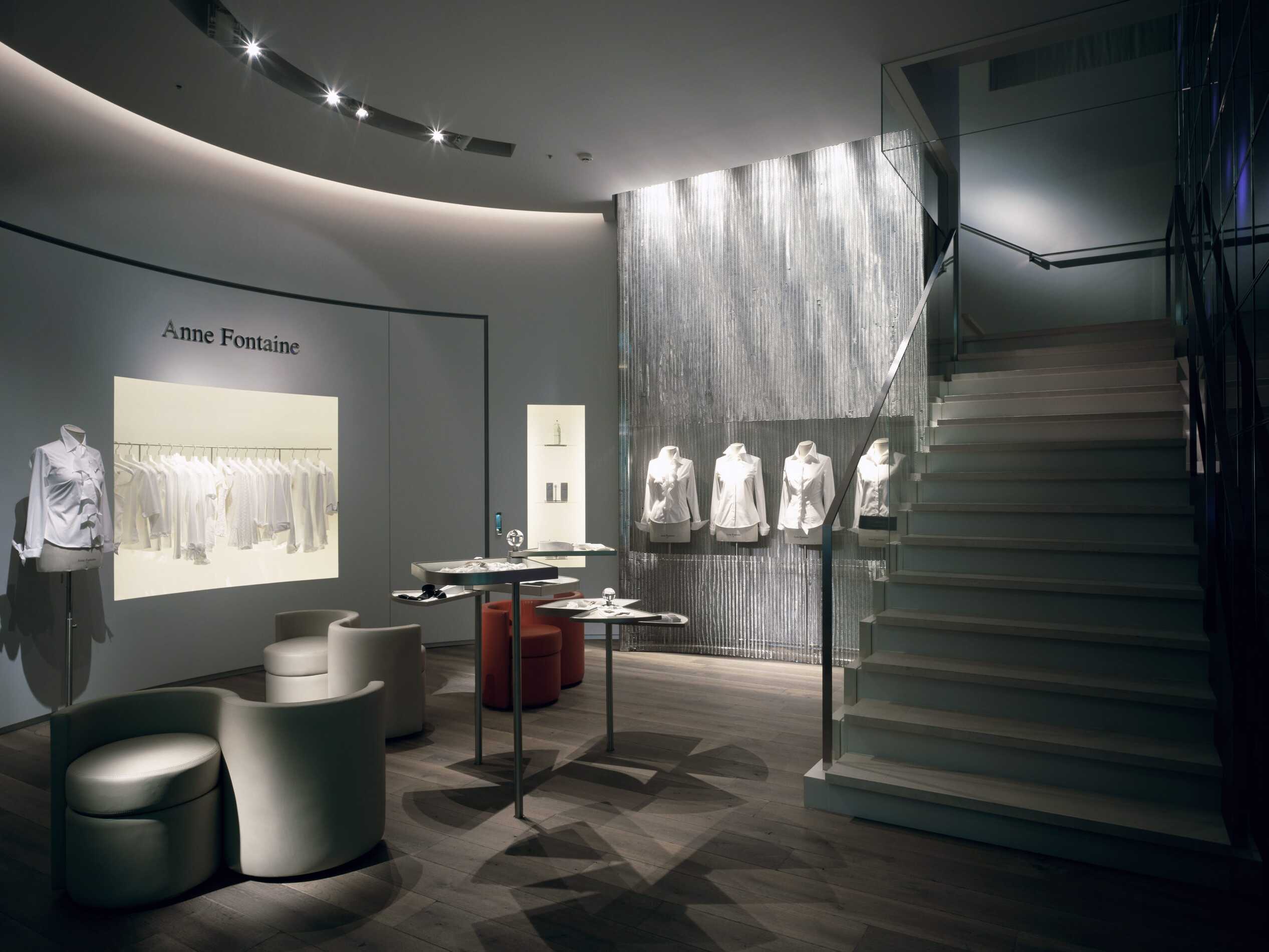 En 2006, Anne Fontaine inaugure à Tokyo, dans le quartier d’Omotesando, une boutique-signature conçue par Andrée Putman, qui prolonge l’univers de la chemise blanche en le mêlant à des courbes élégantes et une esthétique raffinée. L’intérieur se distingue par des vitrines aux formes enveloppantes, un escalier délicatement dessiné, et un hommage à la lumière naturelle à travers un aménagement très lumineux. La façade, soulignée de bois projeté perpendiculairement, offre un contraste harmonieux entre modernité et tradition japonaise. À l’intérieur, les matières nobles comme le bois et la pierre, combinées à des transparences et des jeux de lumière, créent une ambiance feutrée où les chemises se présentent comme des objets précieux.