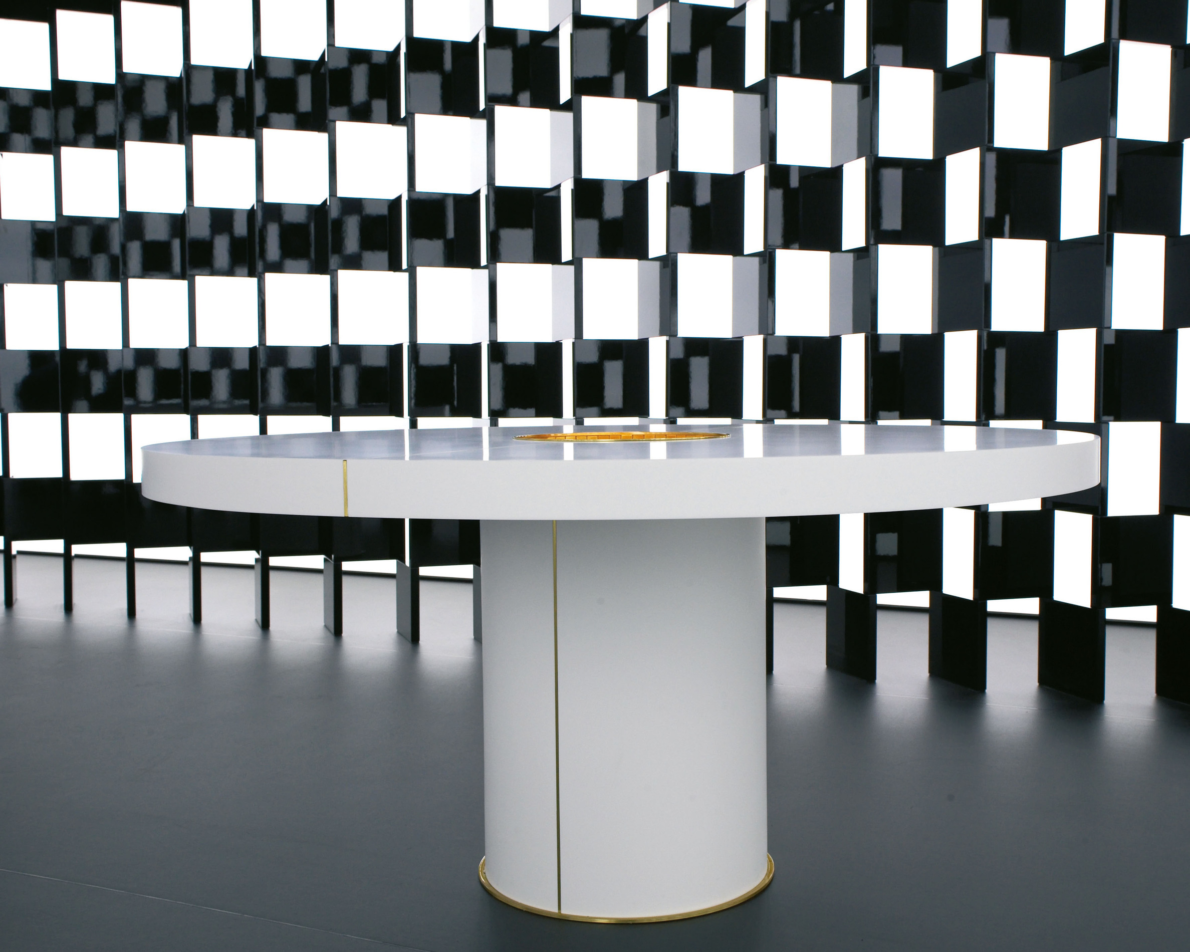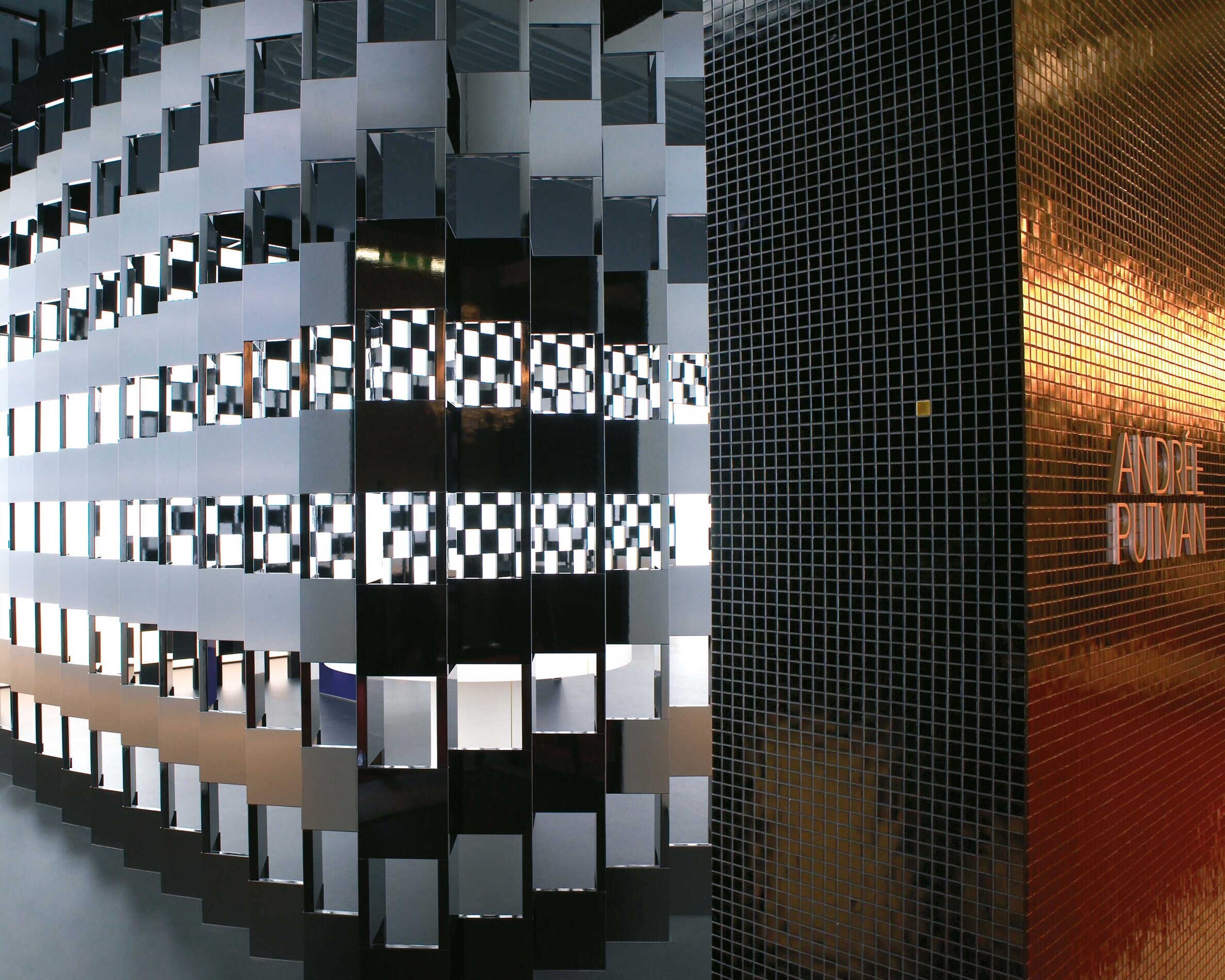En 2008, lors du Salone del Mobile à Milan, la collection Entrevue pour Bisazza signée Andrée Putman révèle une esthétique posée, où le carrelage en mosaïque devient élément graphique à part entière. Parmi les pièces phares, le bureau Correspondances juxtapose surfaces laquées et motifs mosaïque contrastés, ponctués d’un carreau doré, insufflant un jeu visuel subtil à une forme rigoureuse. La scénographie présentée à Superstudio Più met en lumière cette édition comme une œuvre modulaire : surfaces qui se chevauchent, variations chromatiques, et un dialogue entre texture et lumière. Entrevue démontre comment Putman explore la mosaïque non seulement comme ornement, mais comme langage structurel et décoratif.