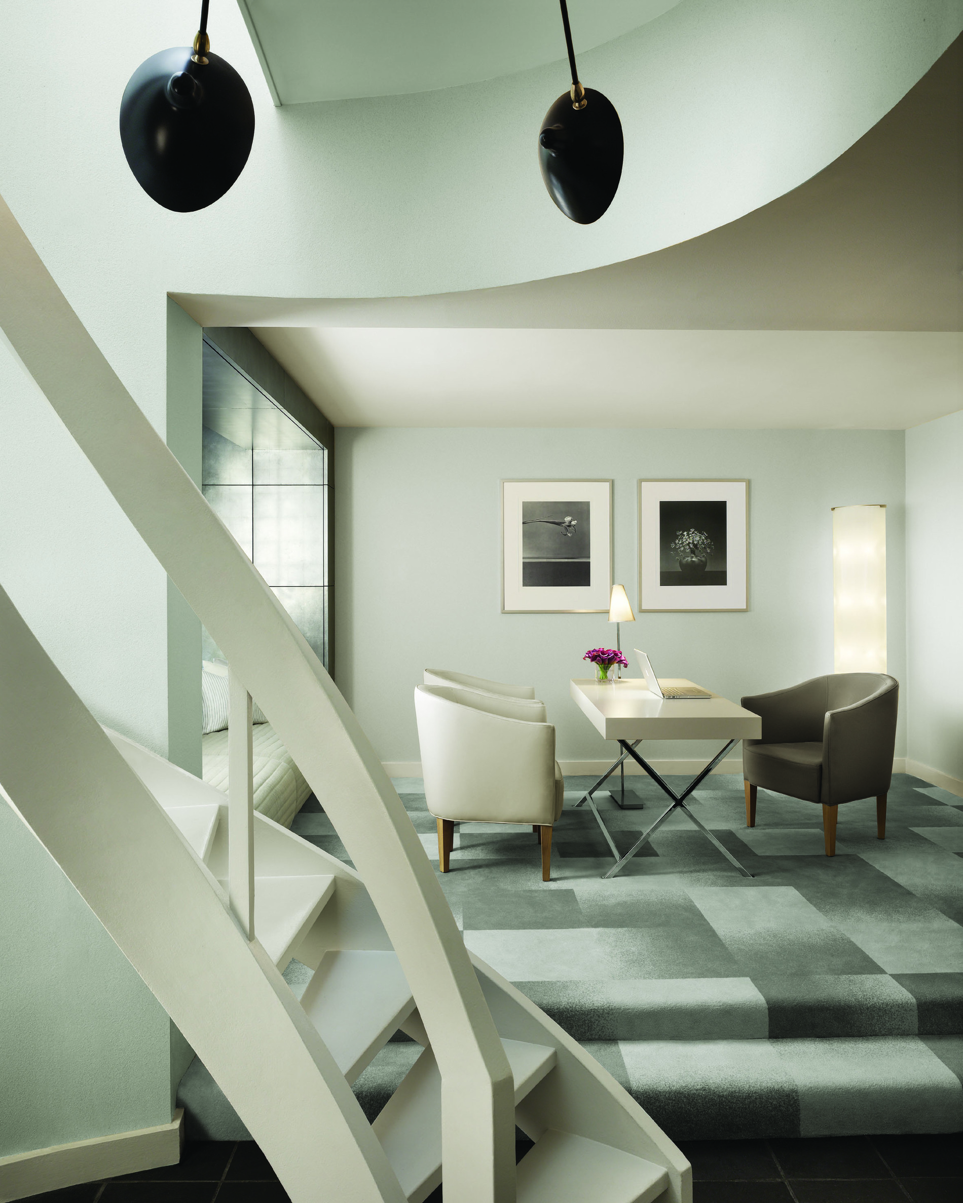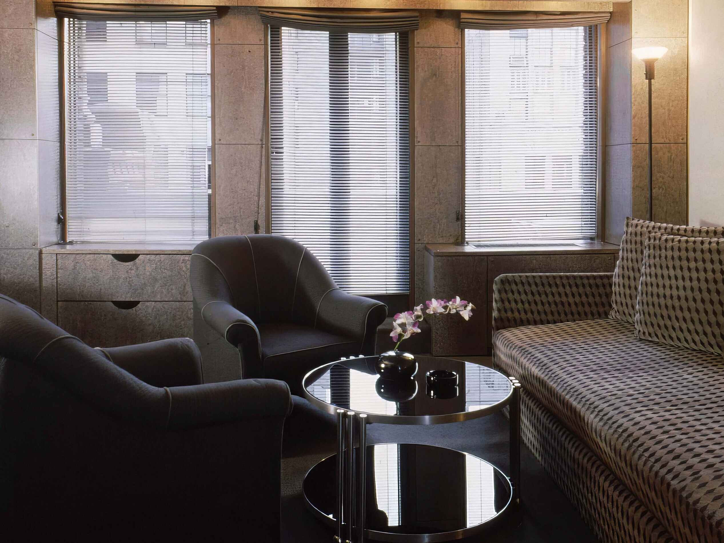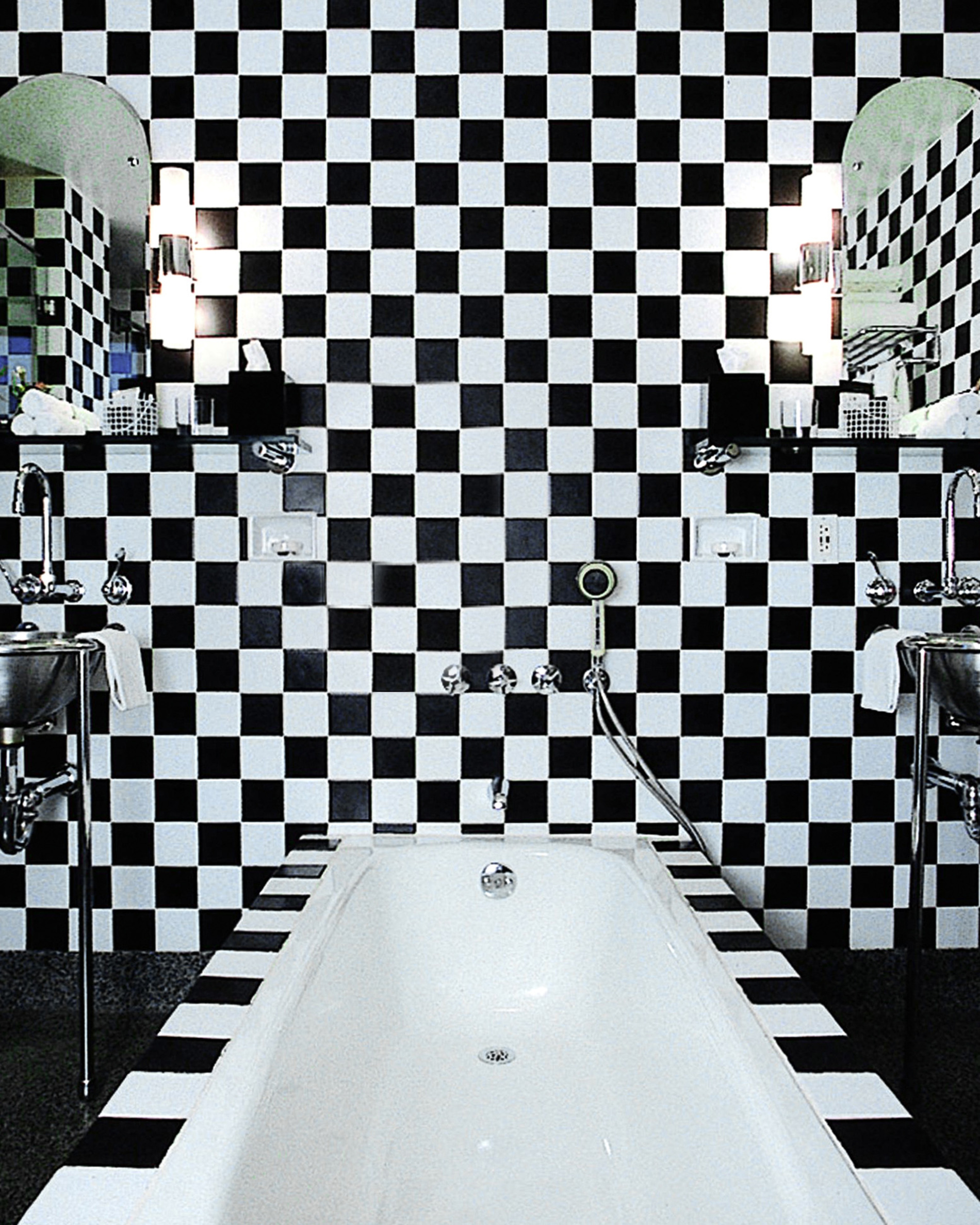 En 1984, Andrée Putman signe pour Ian Schrager et Steve Rubell, fondateurs du mythique Studio 54, le Morgans Hotel, considéré comme le premier boutique-hôtel au monde. Ensemble, ils réinventent l’idée même du luxe : un lieu intime, mesuré, où la sophistication naît de la simplicité. Conçu avec un budget restreint, l’hôtel incarne une révolution esthétique, celle d’un raffinement sans ostentation, d’une élégance fondée sur la justesse et la lumière. Le célèbre damier noir et blanc, dévoilé ici pour la première fois, devient l’une des signatures les plus reconnaissables d’Andrée Putman. Il transforme un espace modeste en manifeste visuel, alliant rigueur graphique et sensualité discrète. Dans ce décor pionnier, chaque détail compte : sols en granite italien, fauteuils club en cuir français, lampes en nickel-plaqué, tapis de laine sur mesure. Le Morgans Hotel impose un nouveau langage de l’hospitalité, celui d’un luxe intime et réfléchi, où l’expérience prime sur la démonstration. Entre ombre et lumière, équilibre et contraste, Andrée Putman crée ici une icône : un lieu à la fois new-yorkais, intemporel et profondément humain.