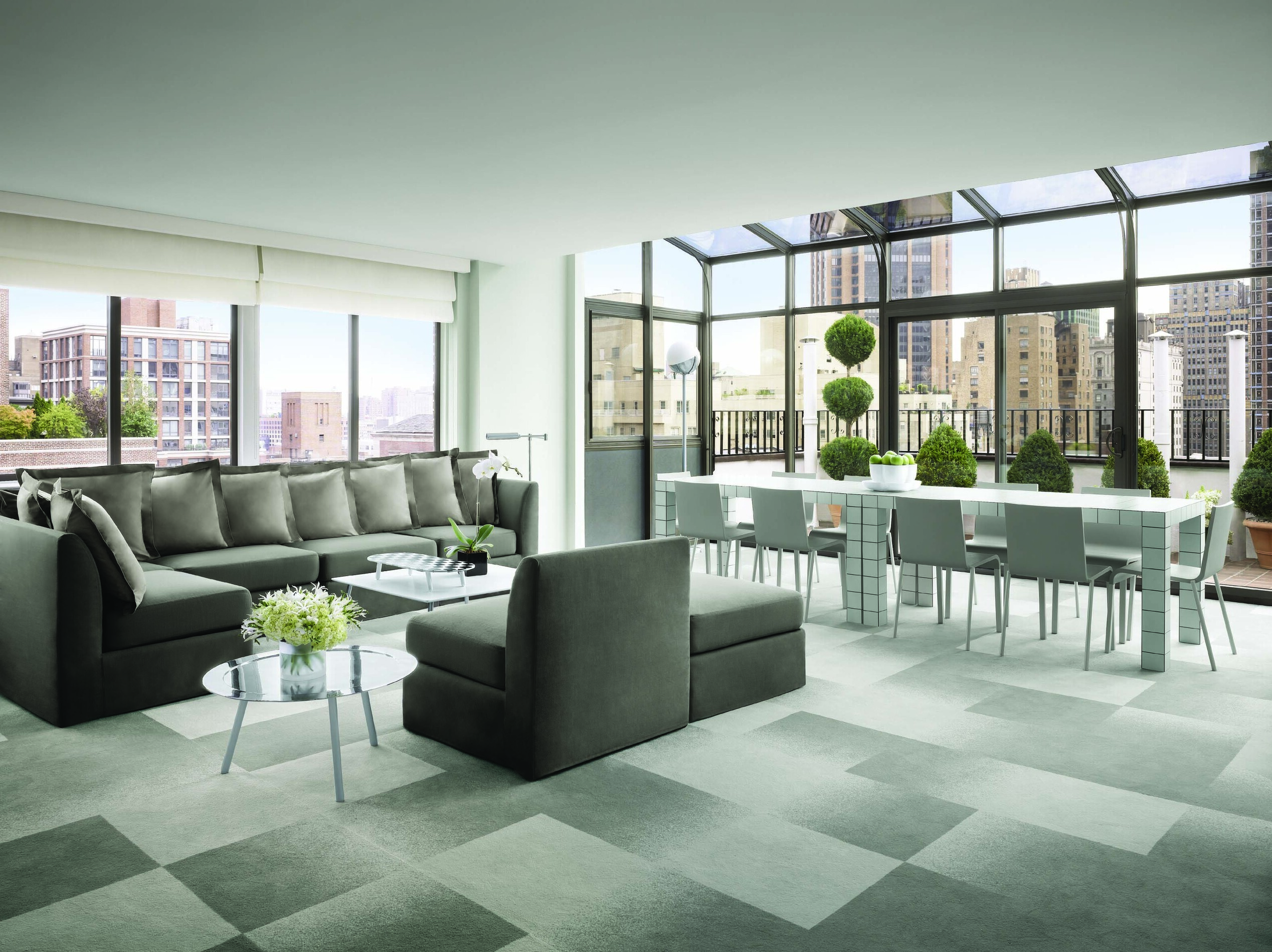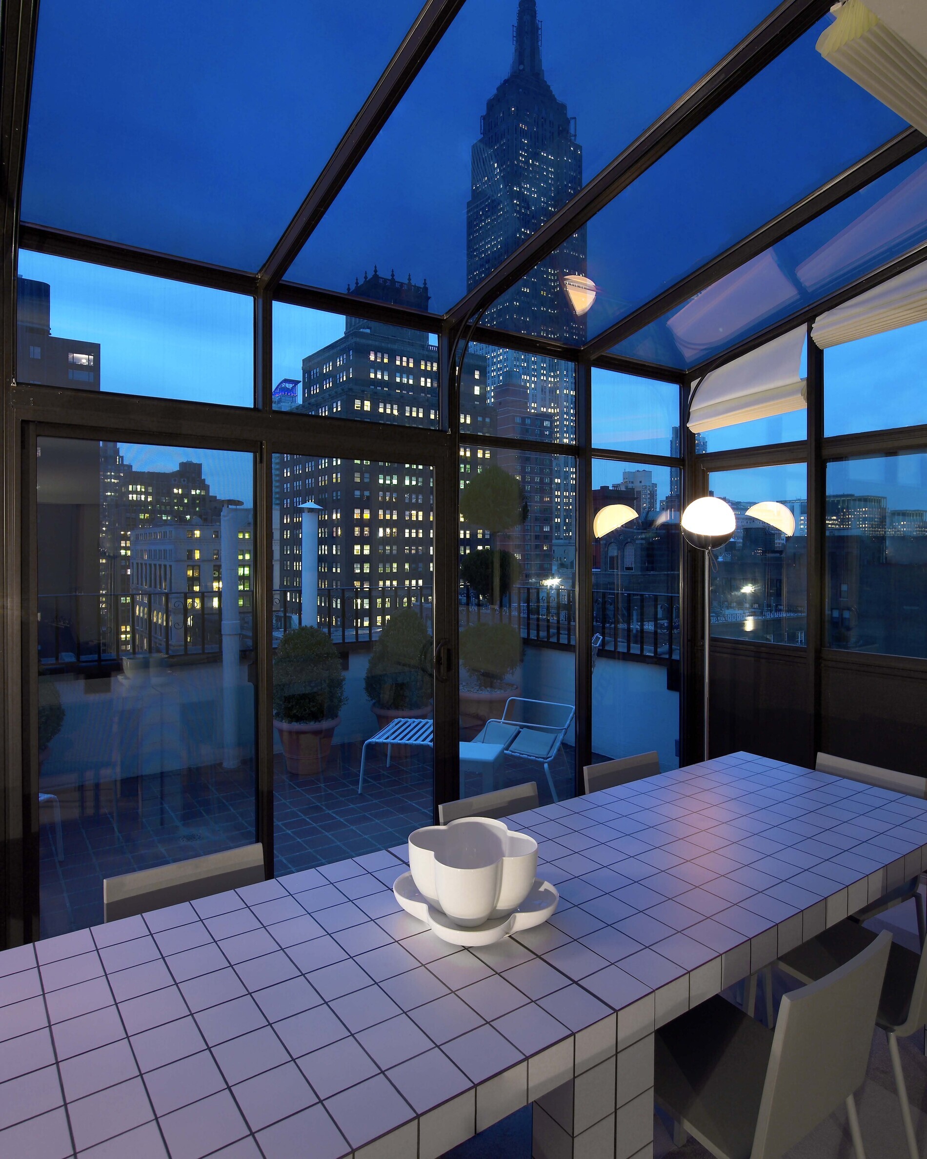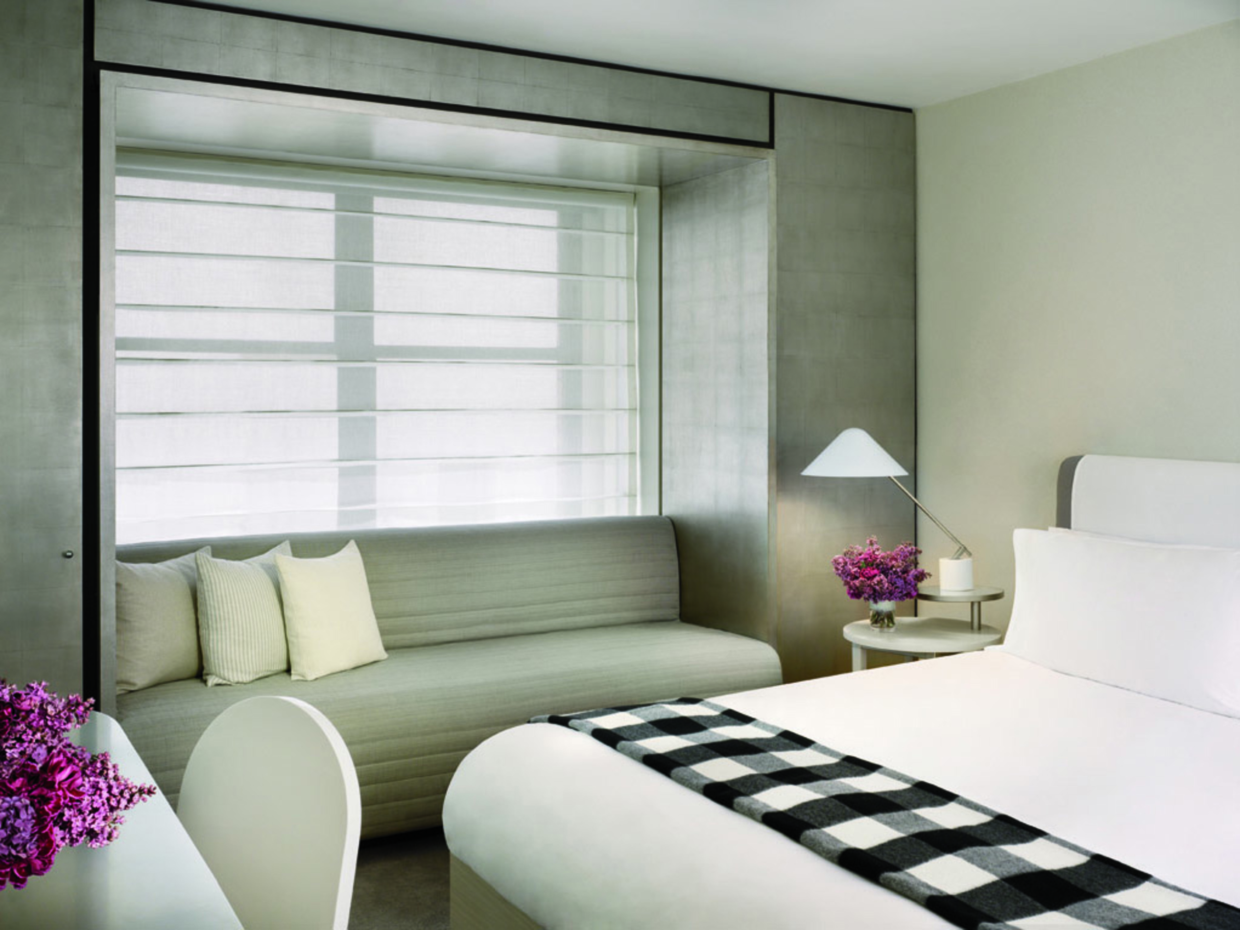 En 1984, Andrée Putman signe pour Ian Schrager et Steve Rubell, fondateurs du mythique Studio 54, le Morgans Hotel, considéré comme le premier boutique-hôtel au monde. Ensemble, ils réinventent l’idée même du luxe : un lieu intime, mesuré, où la sophistication naît de la simplicité. Conçu avec un budget restreint, l’hôtel incarne une révolution esthétique, celle d’un raffinement sans ostentation, d’une élégance fondée sur la justesse et la lumière. Le célèbre damier noir et blanc, dévoilé ici pour la première fois, devient l’une des signatures les plus reconnaissables d’Andrée Putman. Il transforme un espace modeste en manifeste visuel, alliant rigueur graphique et sensualité discrète. Dans ce décor pionnier, chaque détail compte : sols en granite italien, fauteuils club en cuir français, lampes en nickel-plaqué, tapis de laine sur mesure. Le Morgans Hotel impose un nouveau langage de l’hospitalité, celui d’un luxe intime et réfléchi, où l’expérience prime sur la démonstration. Entre ombre et lumière, équilibre et contraste, Andrée Putman crée ici une icône : un lieu à la fois new-yorkais, intemporel et profondément humain.