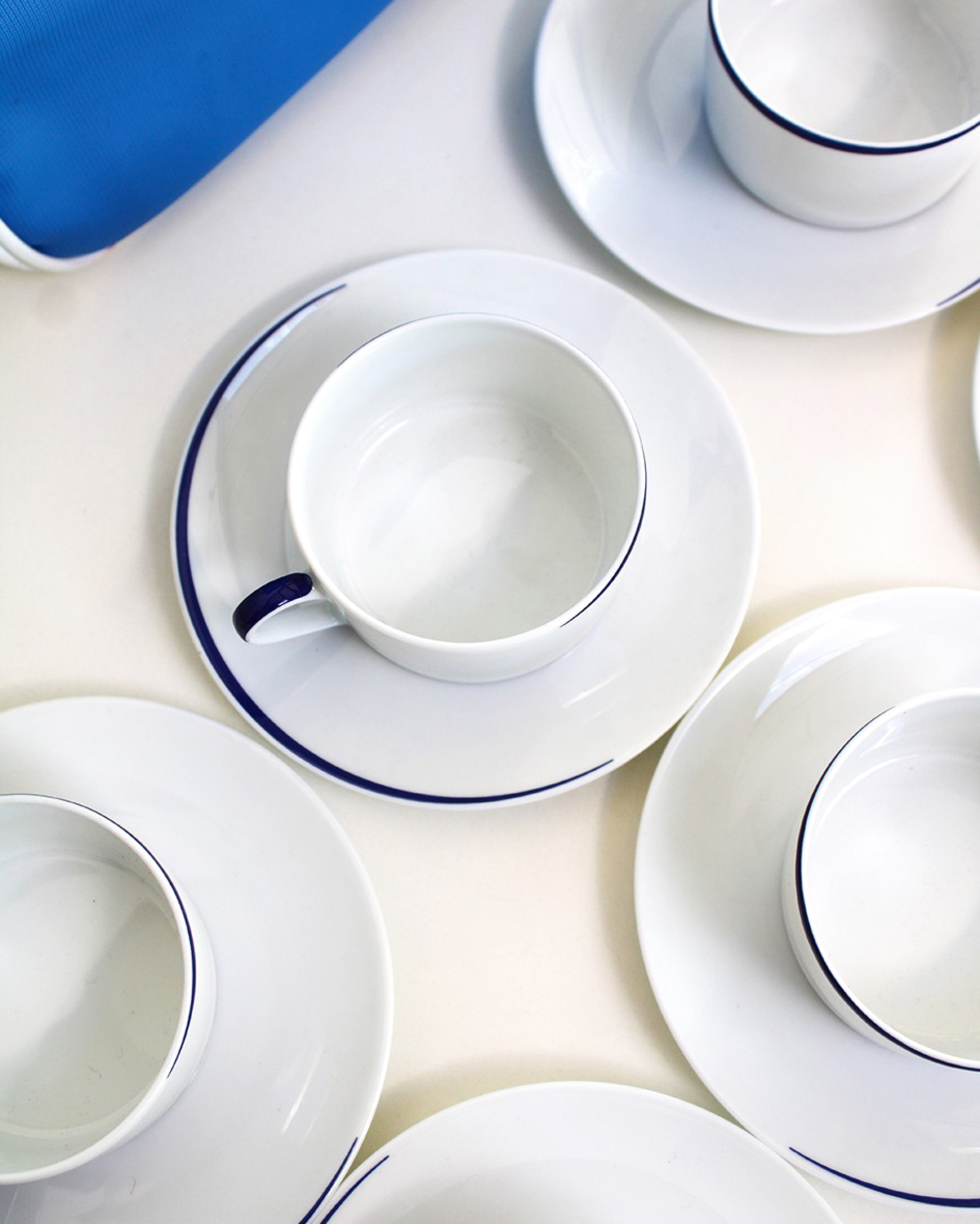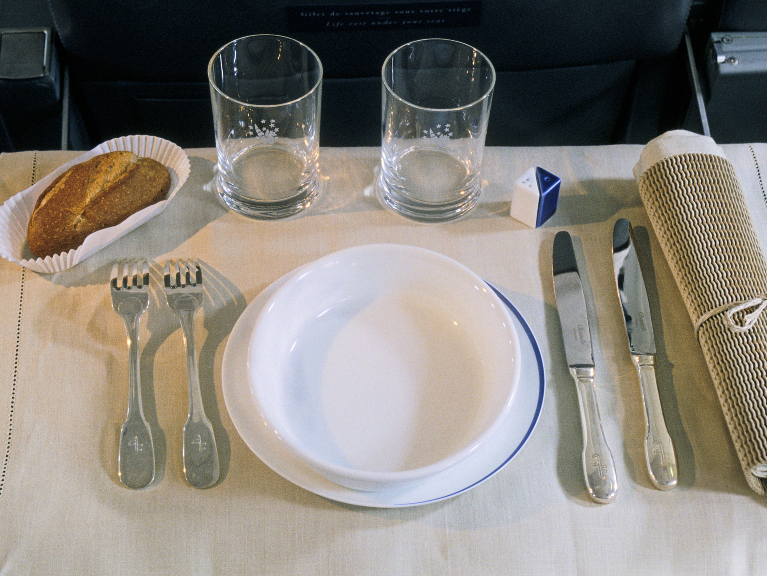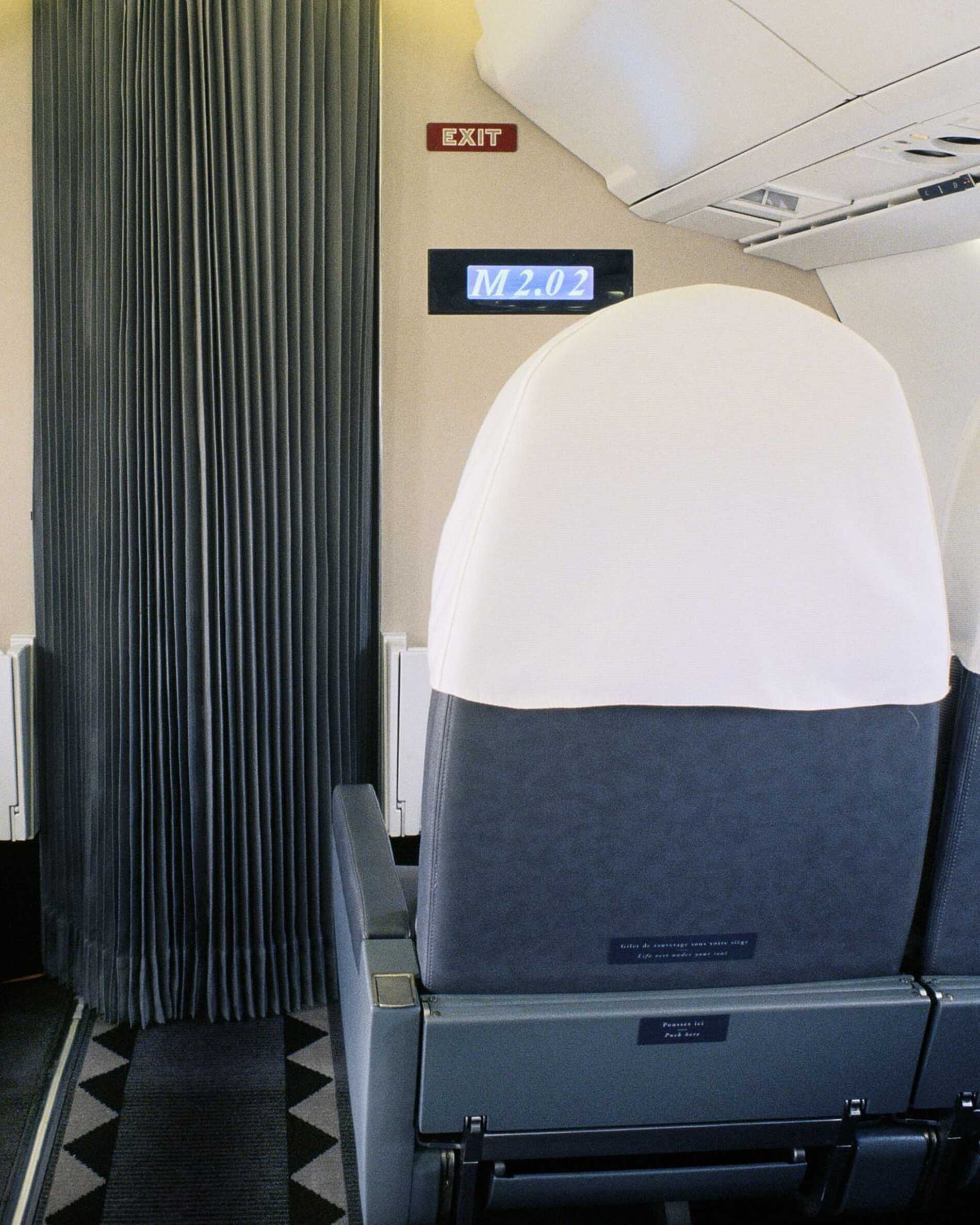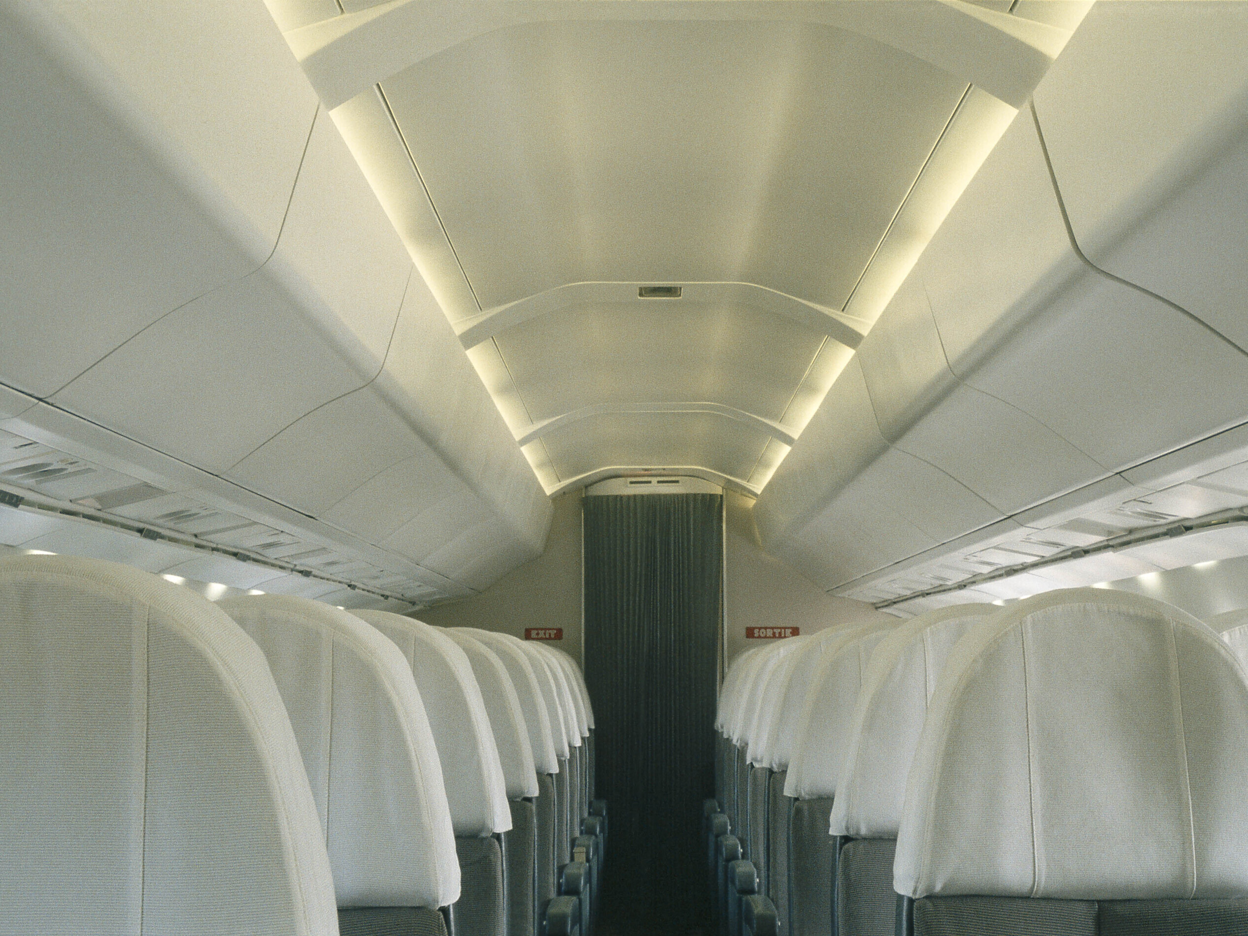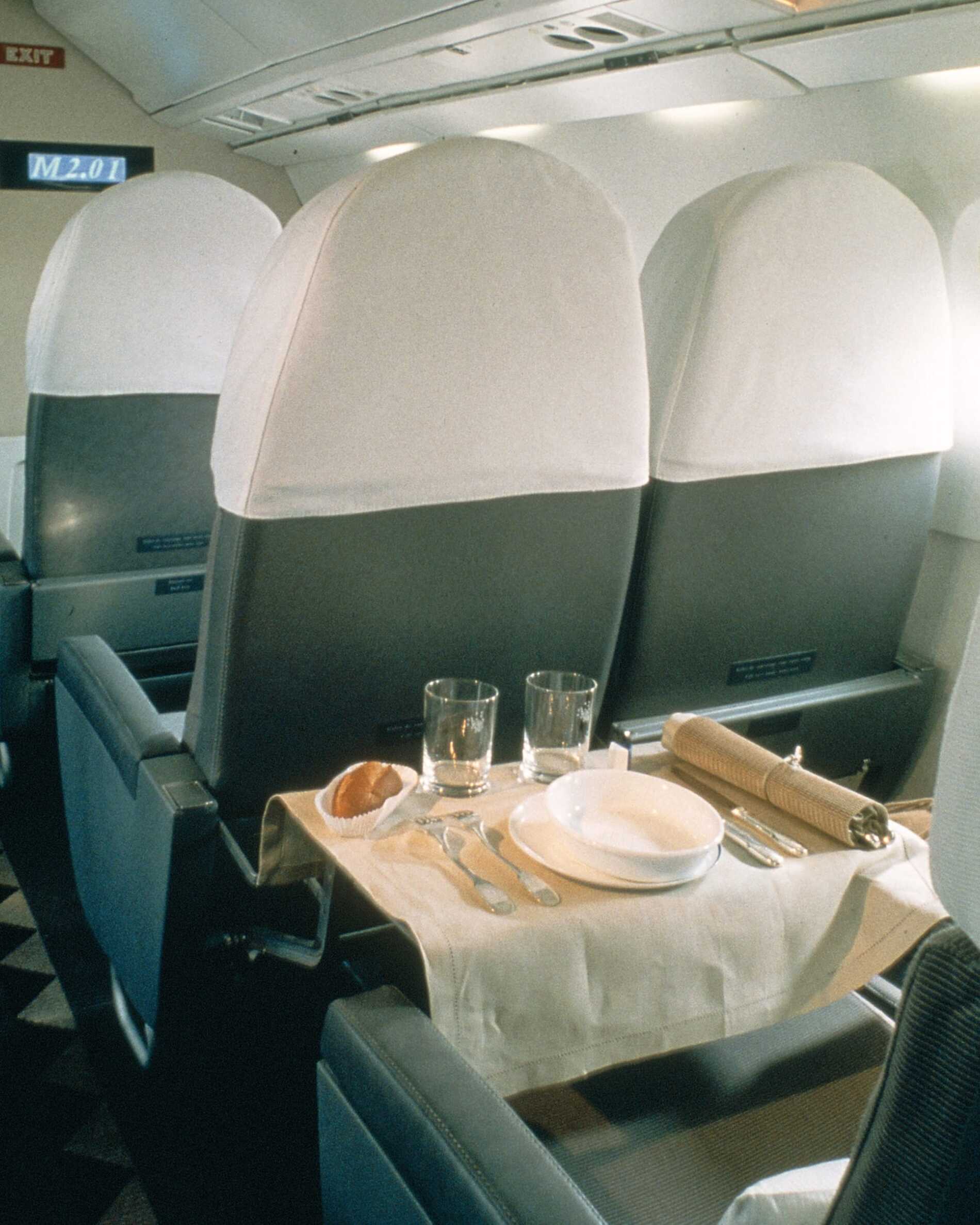 Dans les années 1990, Andrée Putman est choisie par Air France pour repenser l’intérieur du Concorde, symbole ultime du voyage supersonique. Elle entreprend de moderniser l’espace avec rigueur et élégance, en supprimant toute surenchère décorative pour privilégier la clarté, la fluidité et le confort. Le couloir est couvert d’un tapis discret bordé d’une frise de triangles noirs et beiges, tandis que les sièges, habillés de tissus gris perle, sont surmontés de têtières blanches en piqué. Les assiettes en porcelaine s’ornent de liserés bleu Klein, clin d’œil visuel au C du Concorde, et les couverts en argent de Christofle sont délicatement noués dans un écrin de carton gaufré. Avec ce projet, Putman porte un regard attentif sur les petits détails : l’éclairage est repensé en lumière indirecte, les matériaux choisis pour leur élégance et leur durabilité. Elle fait du Concorde non seulement un moyen de transport, mais un écrin de luxe discret, incarnant la vision d’un design français où lumière, espace et qualité se conjuguent pour élever chaque instant du voyage.
