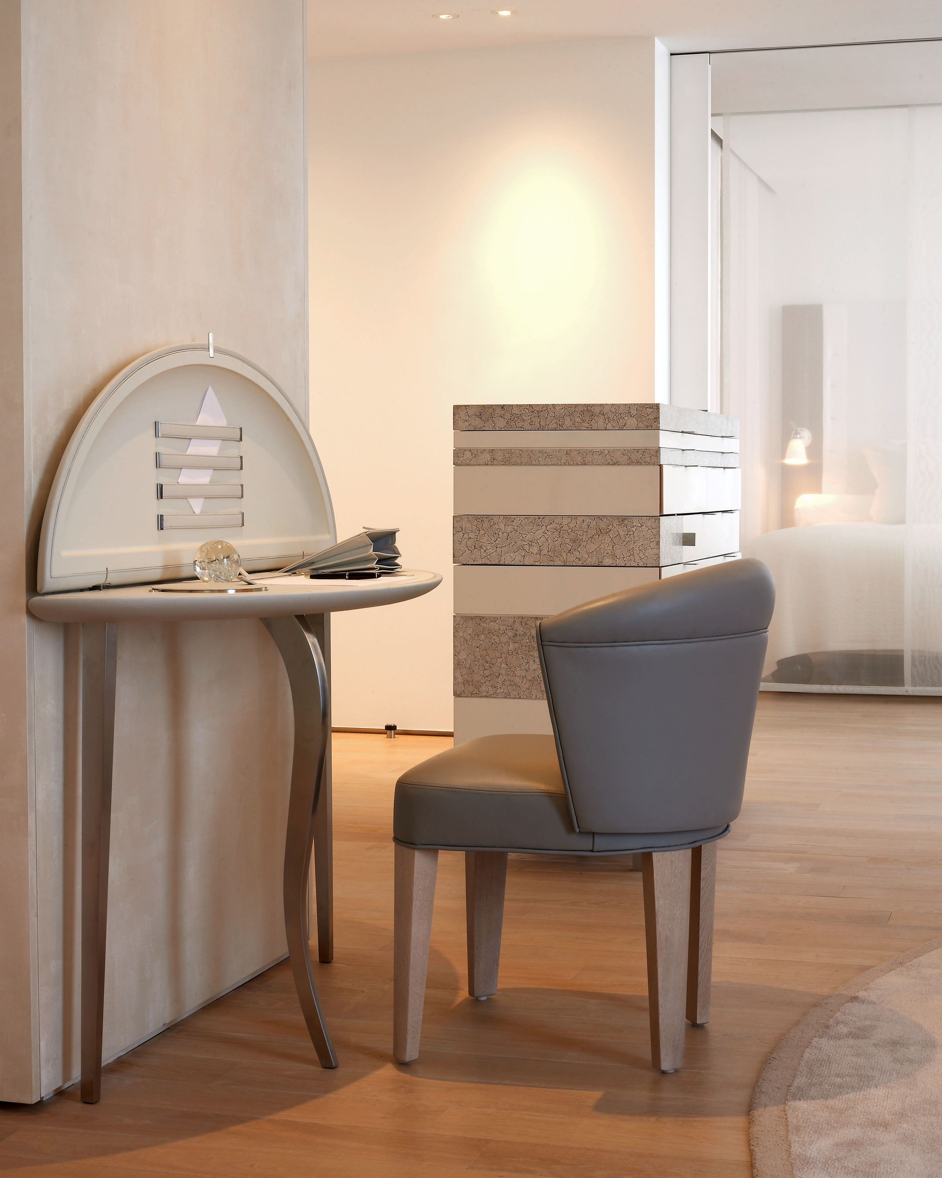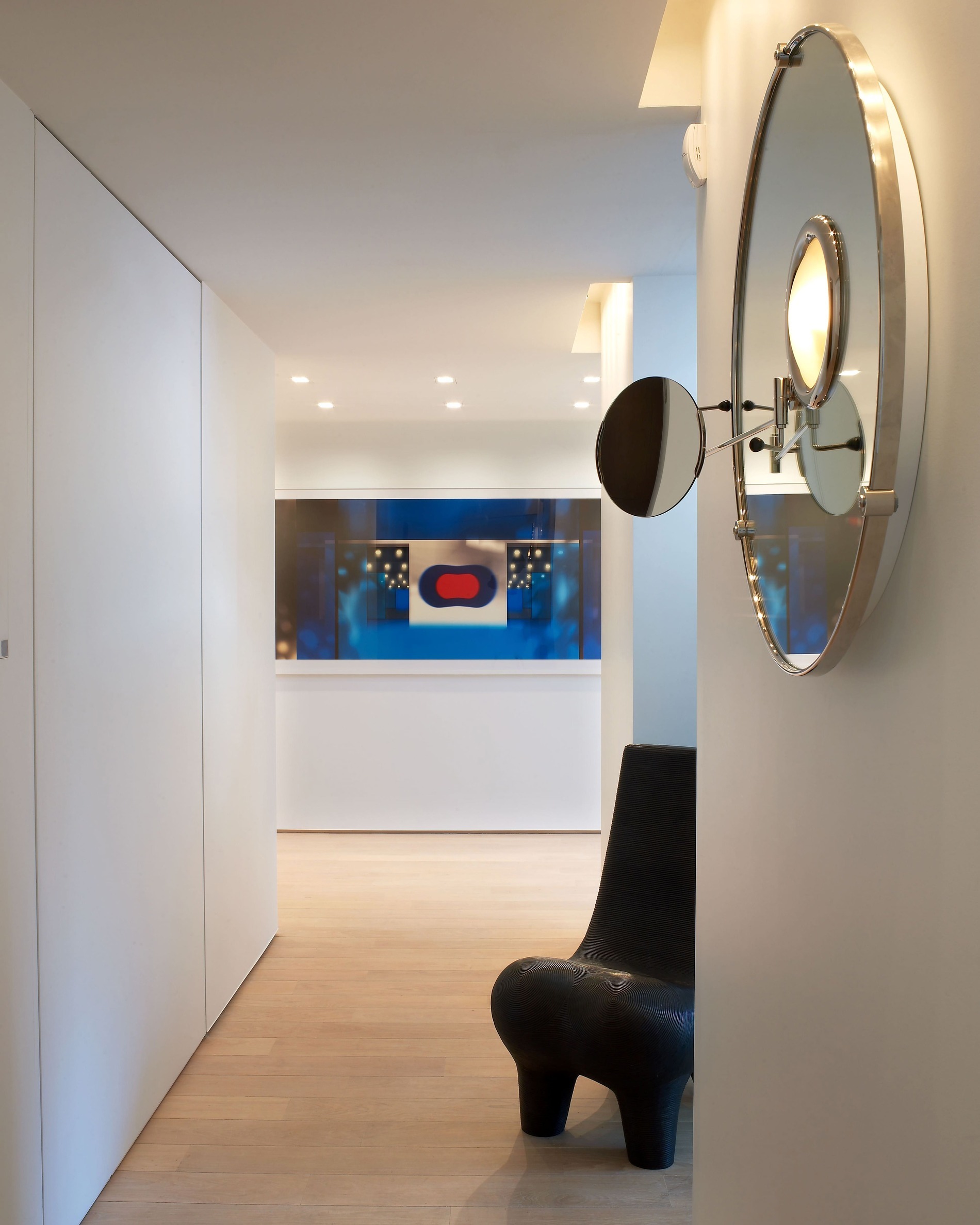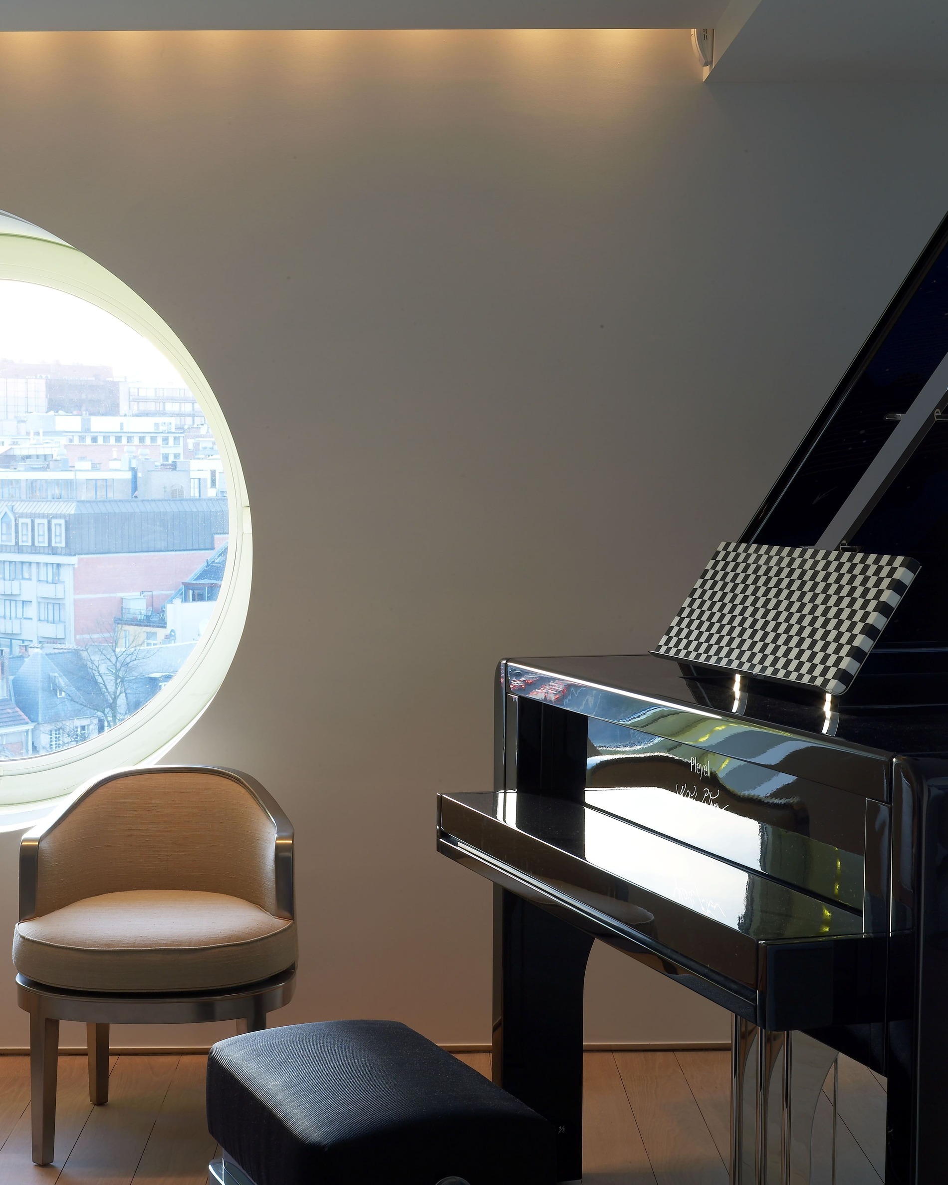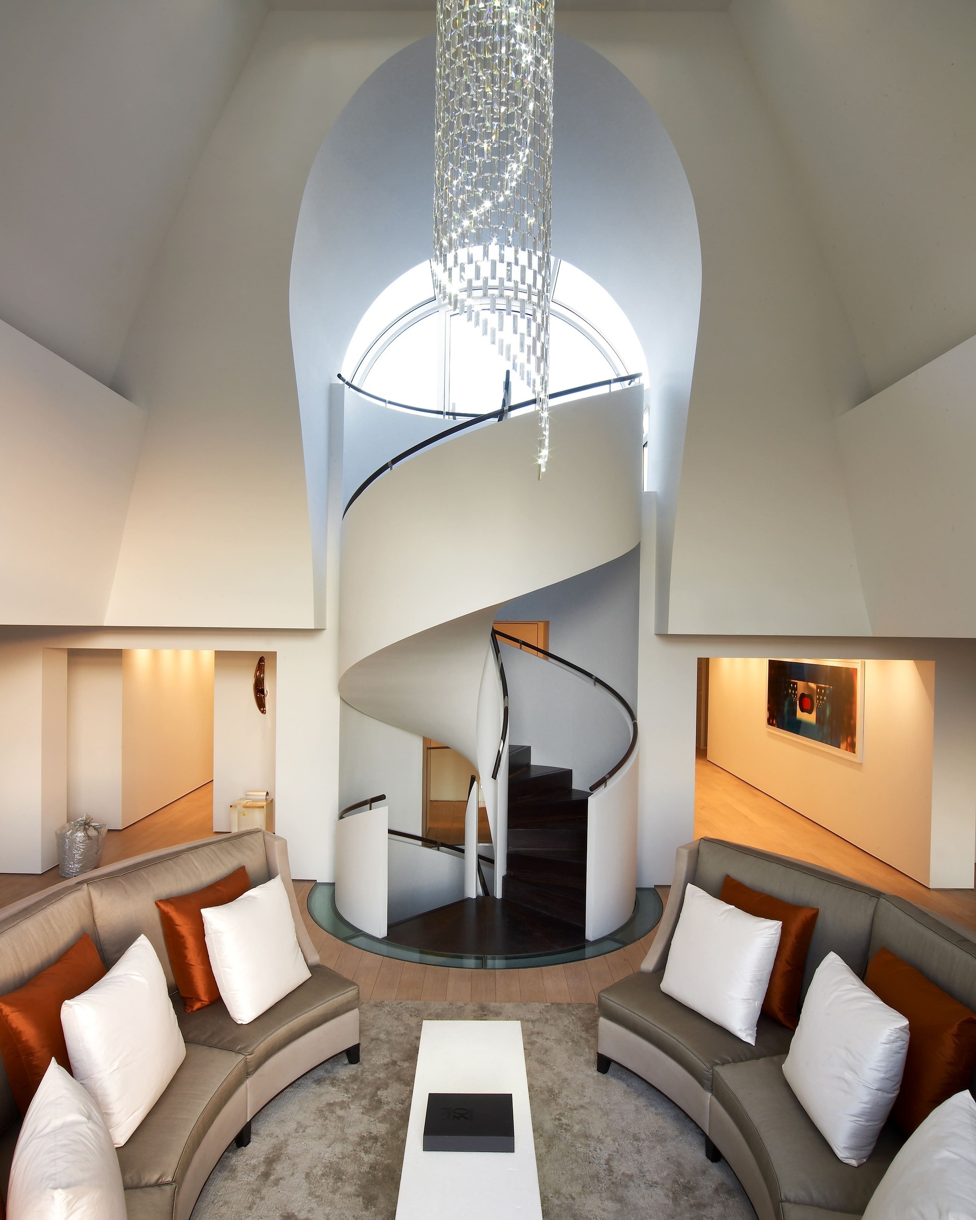 Situé au sommet du Palais du Congo à Bruxelles, l’appartement réalisé en 2008 s’étend sur trois niveaux. L’architecture intérieure y explore les rapports d’échelle et de fluidité, en jouant avec la monumentalité de l’immeuble art déco et l’intimité des espaces domestiques. Au cœur du projet, un vaste salon cathédrale déploie sa hauteur vertigineuse. Le mobilier, travaillé en arc de cercle et en lignes parallèles, vient structurer l’espace sous la grande voûte, tandis qu’un escalier helicoïdal s’élève comme une sculpture et relie les niveaux dans une continuité aérienne. Plus qu’une pièce de réception, ce volume est une scène vivante où chaque espace trouve son usage : contemplation, lecture, partage. L’appartement dans son ensemble s’organise comme une succession de séquences, entre espaces ouverts baignés de lumière et alcôves plus feutrées. La distribution subtile permet de transformer la contrainte d’un lieu en un récit d’équilibre, où l’élan monumental dialogue avec l’usage quotidien.