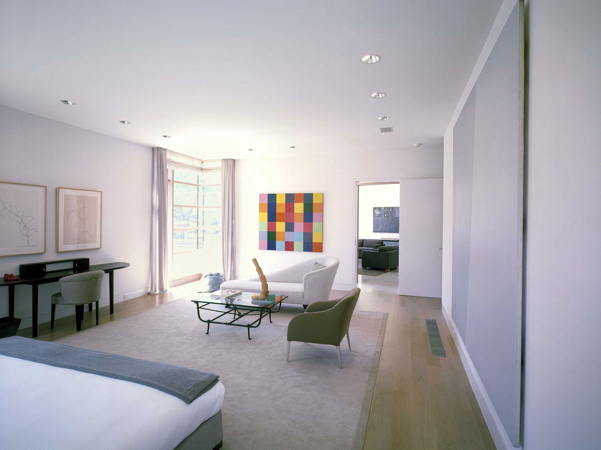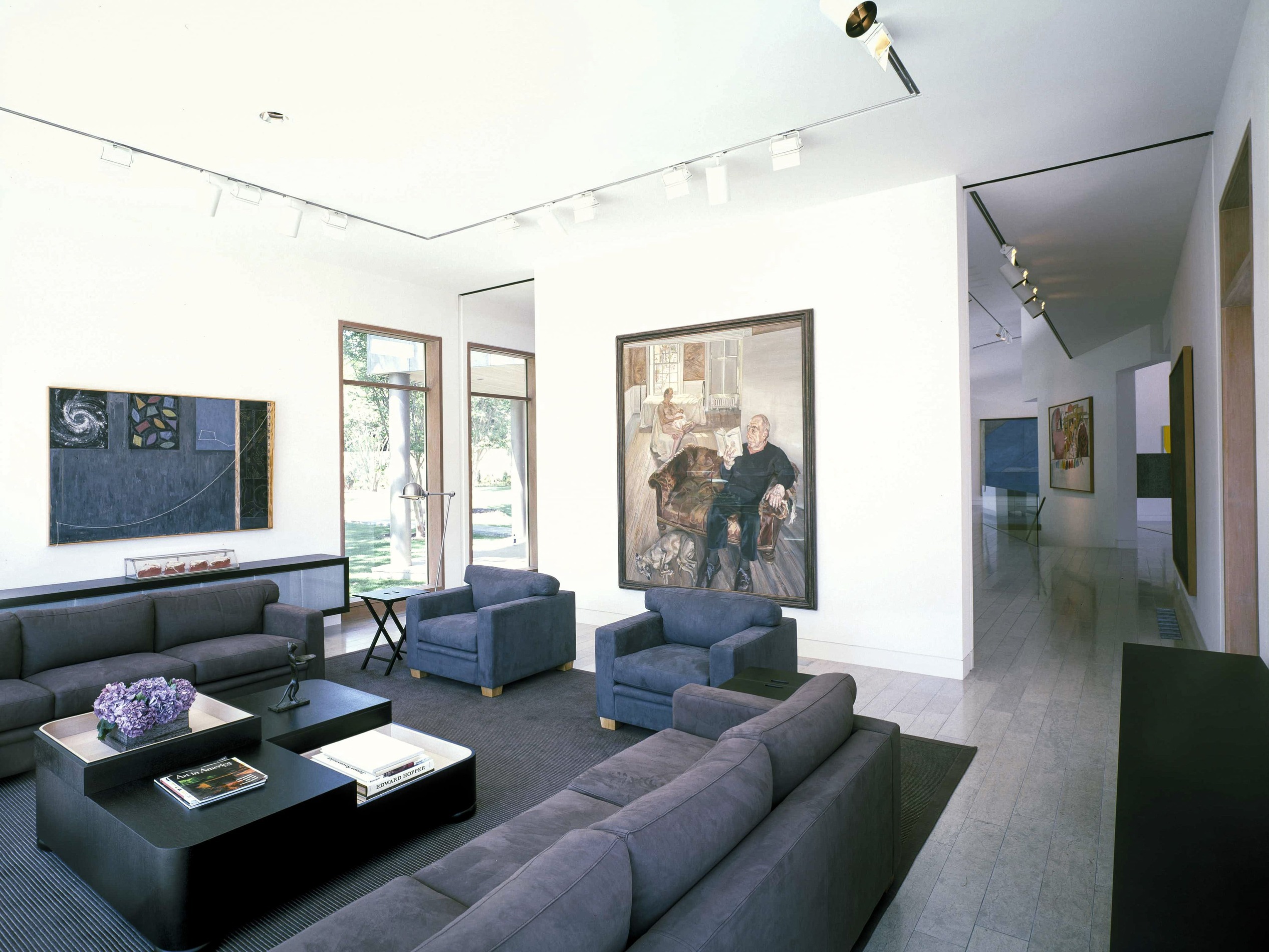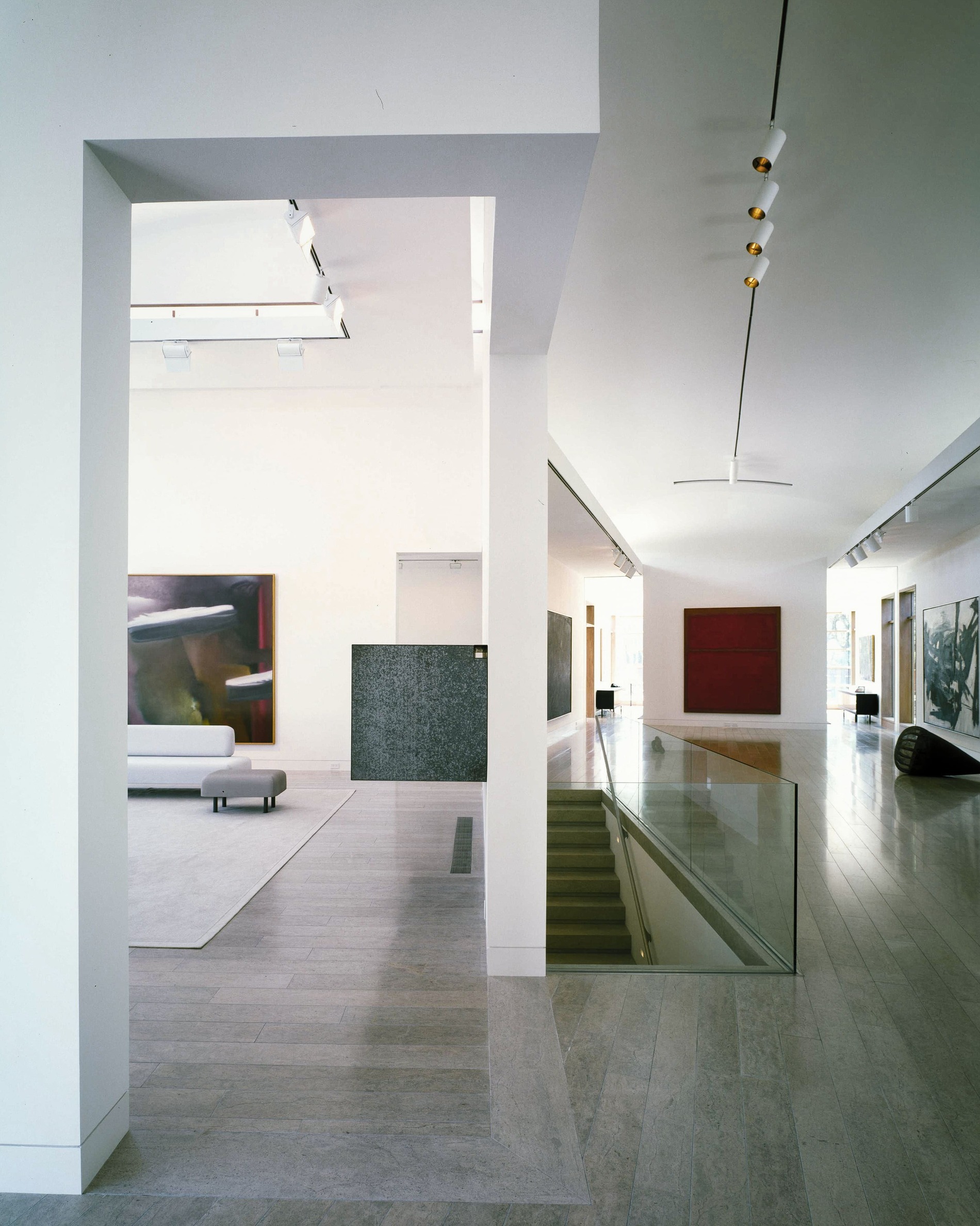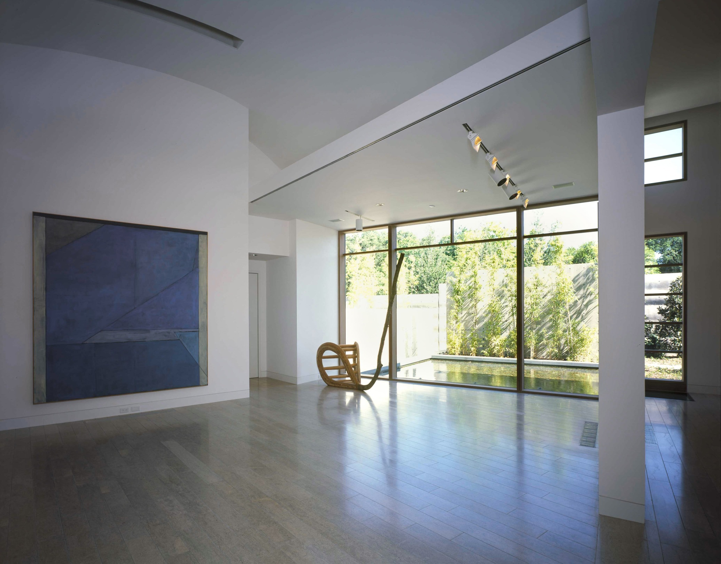 Située à Preston Hollow, la galerie et la maison d’hôtes conçue par Bill Booziotis en collaboration avec Andrée Putman se déploie comme un espace hybride, à la fois résidentiel et muséal. Les volumes sont articulés pour accueillir la vie quotidienne et la mise en scène des œuvres et du mobilier, chaque angle et chaque ouverture étant pensé pour sublimer les objets et créer un dialogue entre lumière, matière et perspective. Les murs continus, les portes d’angle et les fenêtres stratégiquement positionnées offrent des vues inédites et des cadres pour les collections. Le plafond voûté en berceau, complexe et sculptural, amplifie la profondeur et rythme les parcours, transformant la promenade à travers les espaces en un parcours sensible et vivant. La lumière diffuse se déplace, caressant les surfaces et révélant la qualité des textures et du mobilier, où chaque objet devient un point d’attention. Cette réalisation / collaboration révèle l’esprit d’Andrée Putman dans sa capacité à conjuguer fonctionnalité et émotion. Ici, chaque pièce, chaque perspective, est conçue pour mettre en valeur l’art et le design, tout en offrant un confort subtil et raffiné. L’espace devient ainsi une expérience immersive, où la circulation, la lumière et les volumes orchestrent la rencontre entre l’architecture et le mobilier.