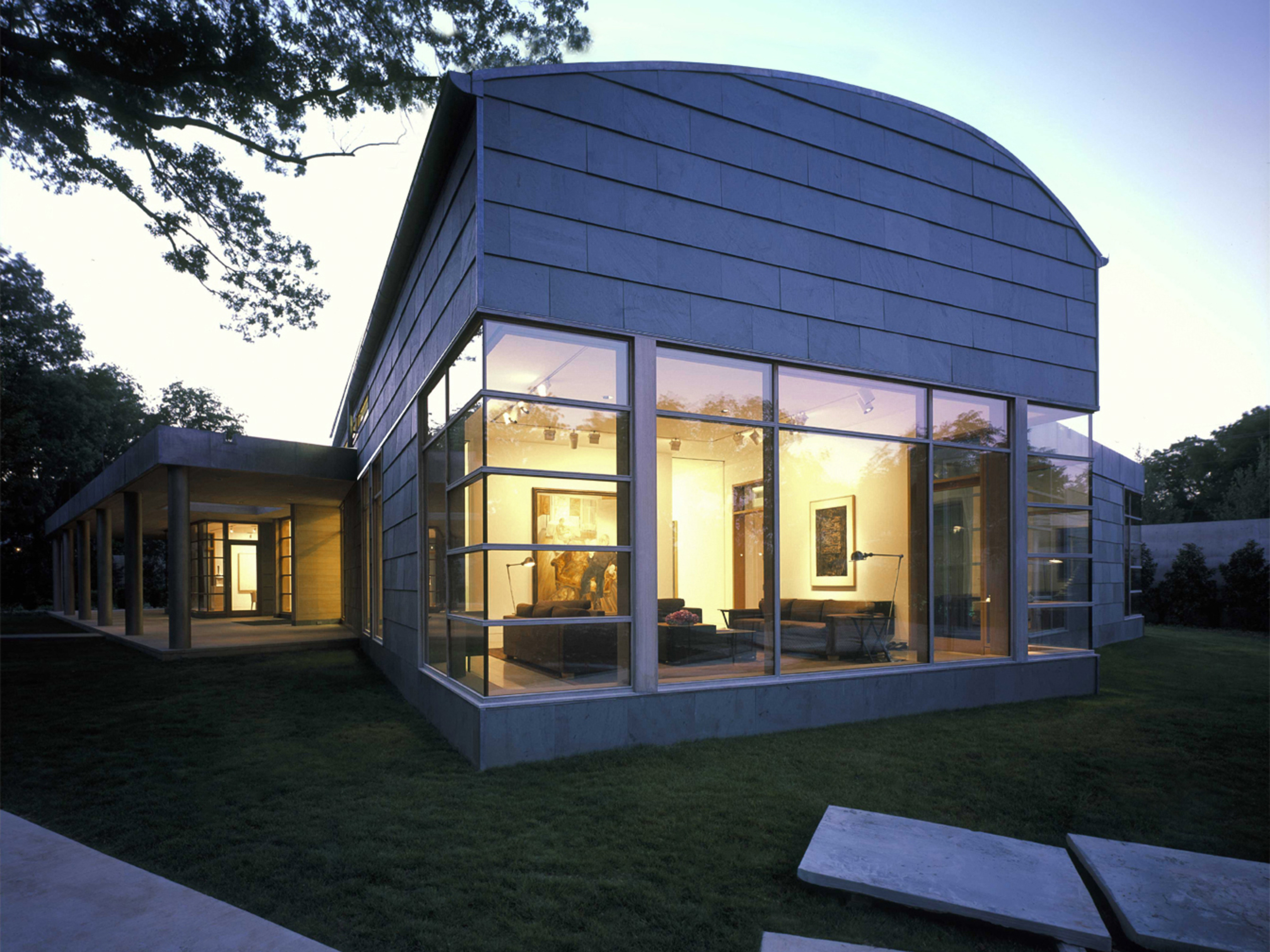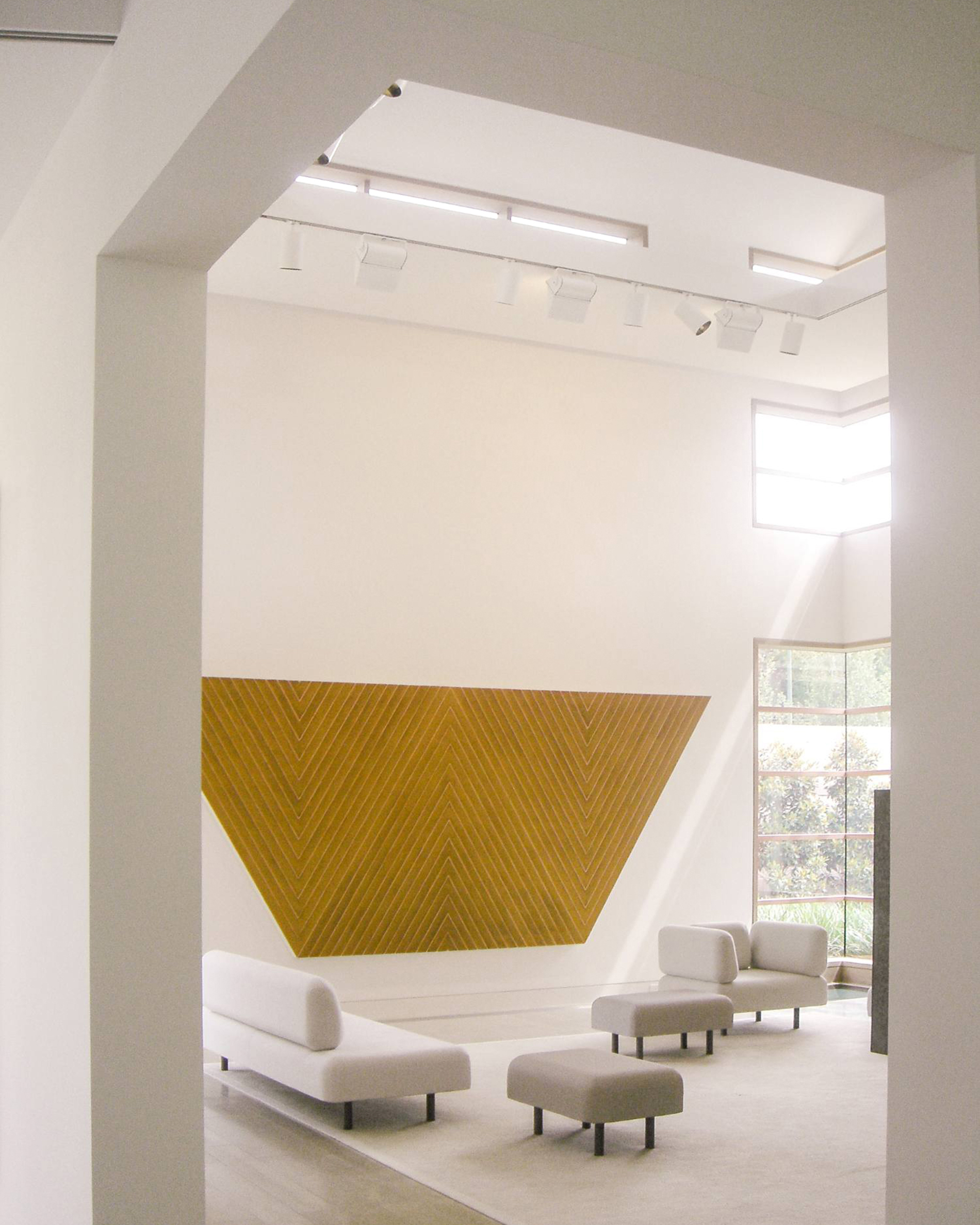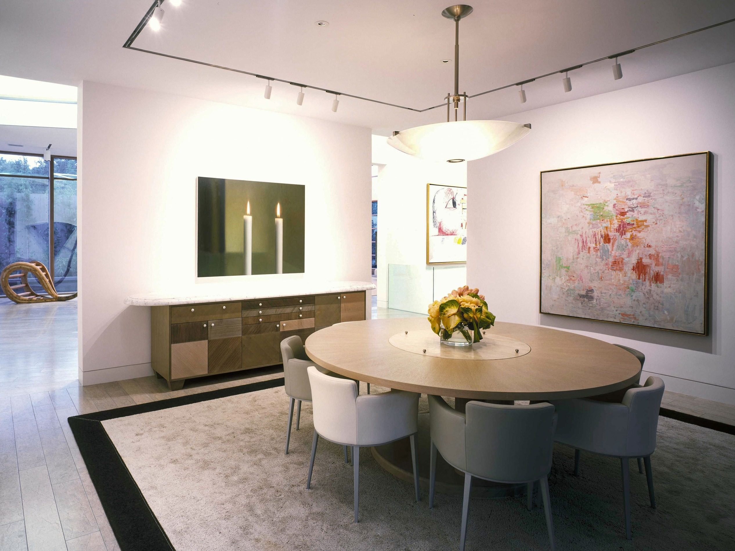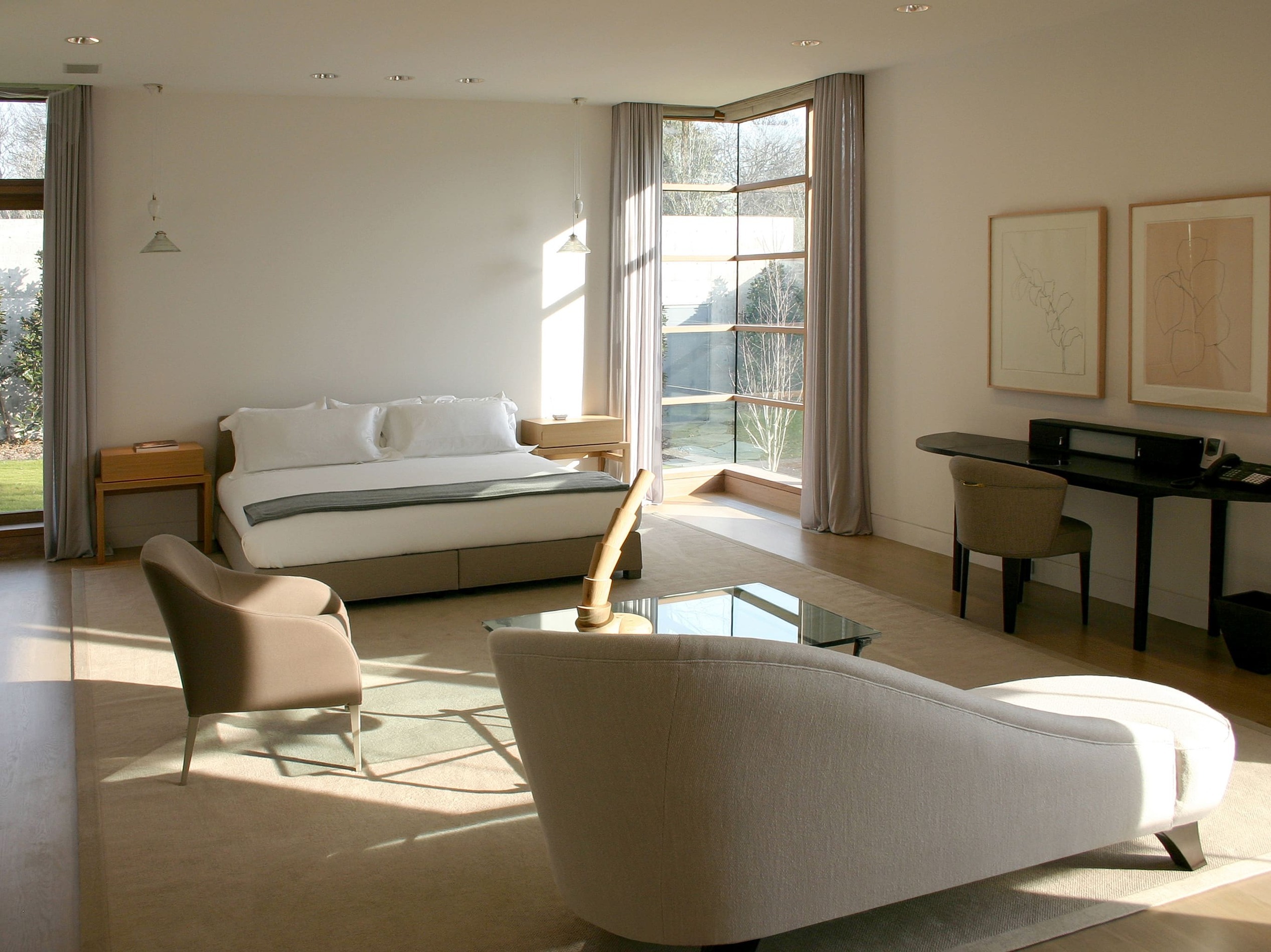 Située à Preston Hollow, la galerie et la maison d’hôtes conçue par Bill Booziotis en collaboration avec Andrée Putman se déploie comme un espace hybride, à la fois résidentiel et muséal. Les volumes sont articulés pour accueillir la vie quotidienne et la mise en scène des œuvres et du mobilier, chaque angle et chaque ouverture étant pensé pour sublimer les objets et créer un dialogue entre lumière, matière et perspective. Les murs continus, les portes d’angle et les fenêtres stratégiquement positionnées offrent des vues inédites et des cadres pour les collections. Le plafond voûté en berceau, complexe et sculptural, amplifie la profondeur et rythme les parcours, transformant la promenade à travers les espaces en un parcours sensible et vivant. La lumière diffuse se déplace, caressant les surfaces et révélant la qualité des textures et du mobilier, où chaque objet devient un point d’attention. Cette réalisation / collaboration révèle l’esprit d’Andrée Putman dans sa capacité à conjuguer fonctionnalité et émotion. Ici, chaque pièce, chaque perspective, est conçue pour mettre en valeur l’art et le design, tout en offrant un confort subtil et raffiné. L’espace devient ainsi une expérience immersive, où la circulation, la lumière et les volumes orchestrent la rencontre entre l’architecture et le mobilier.