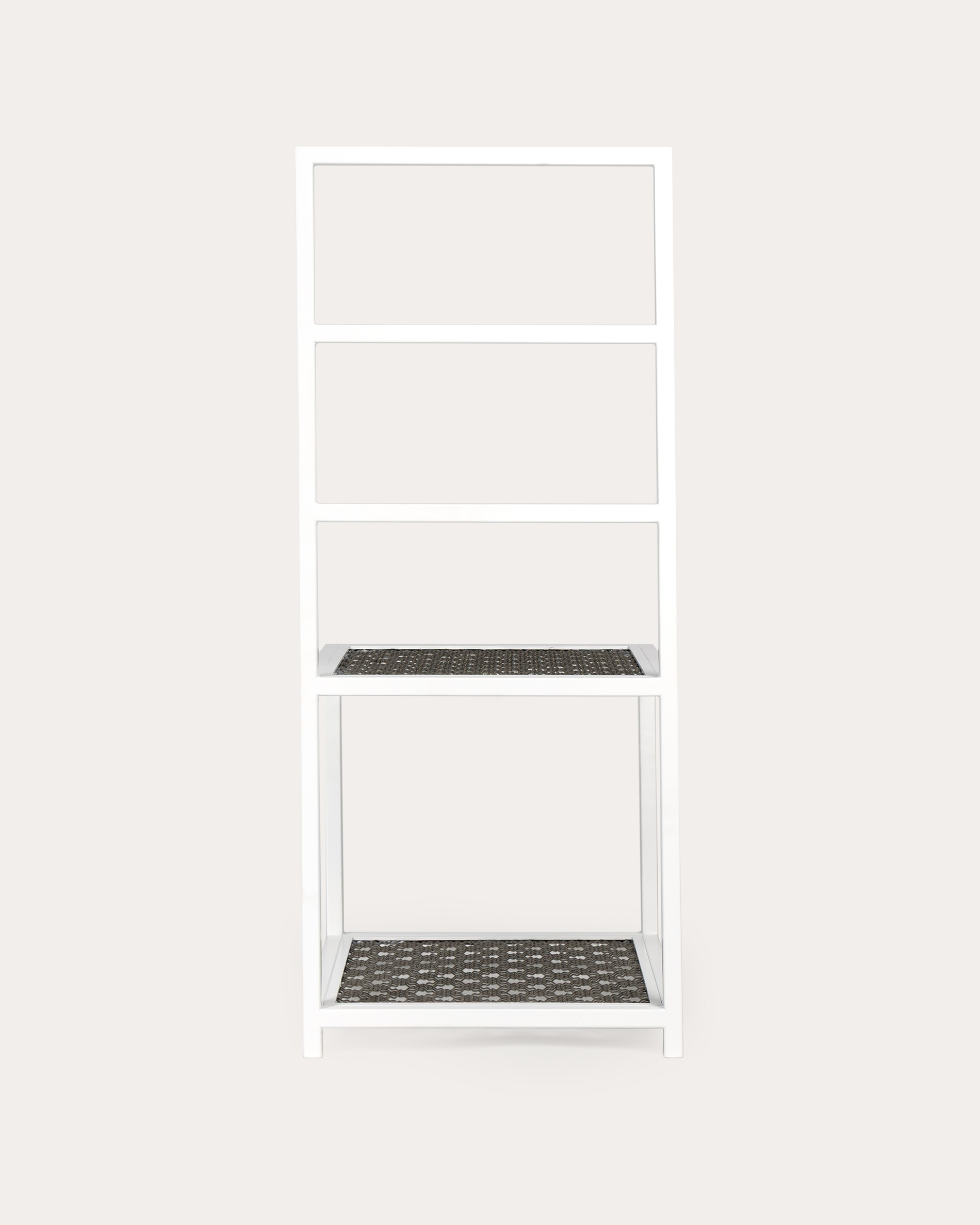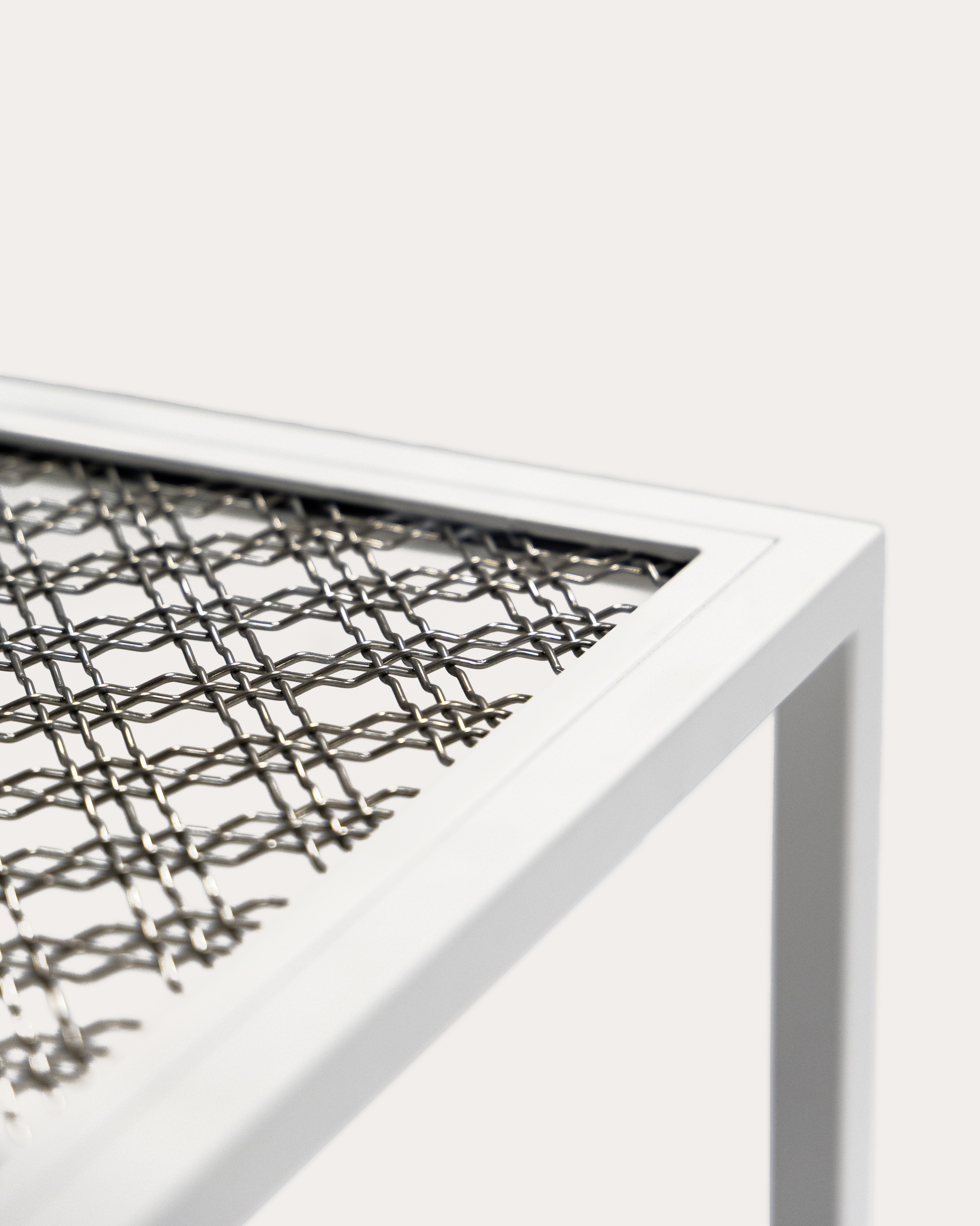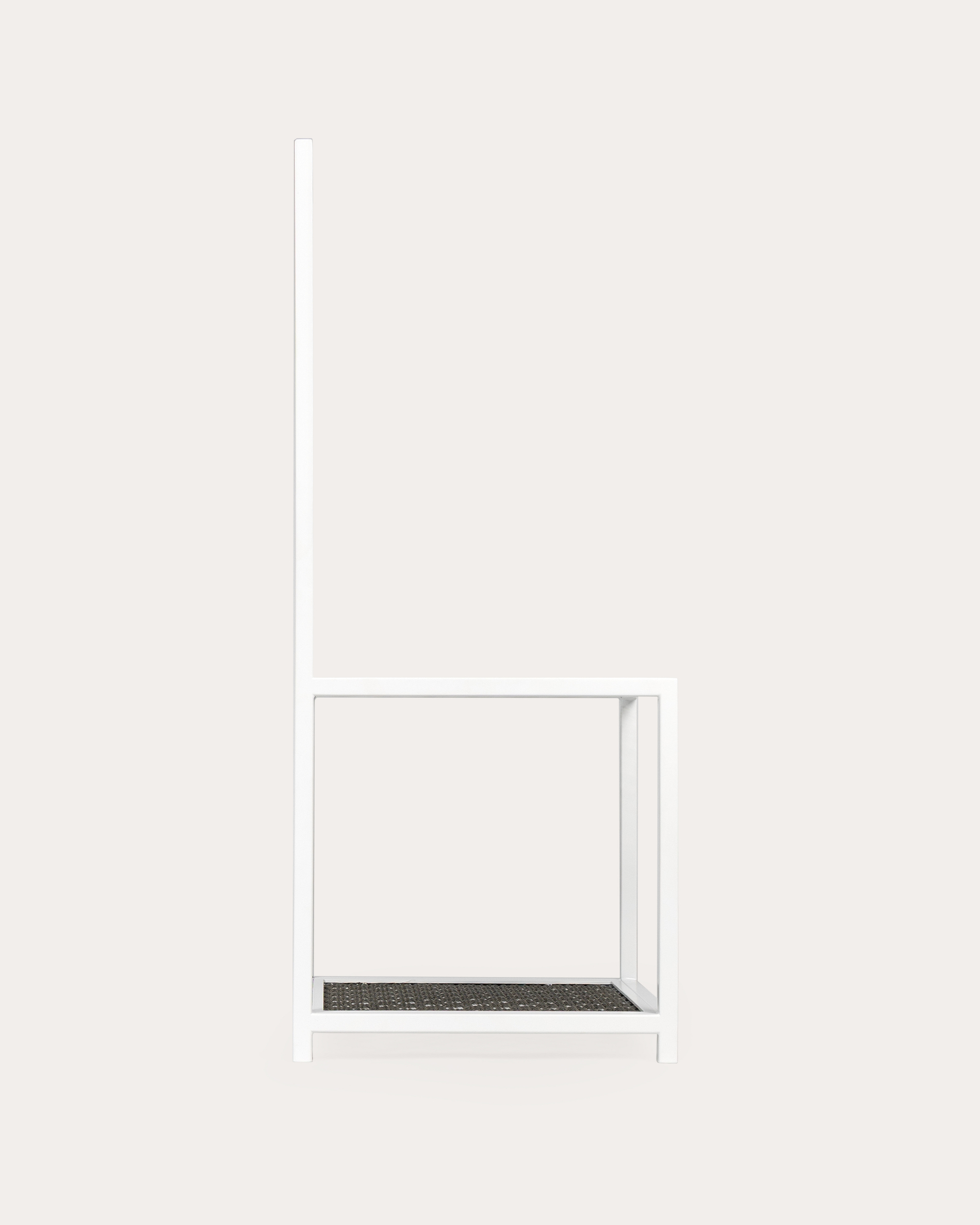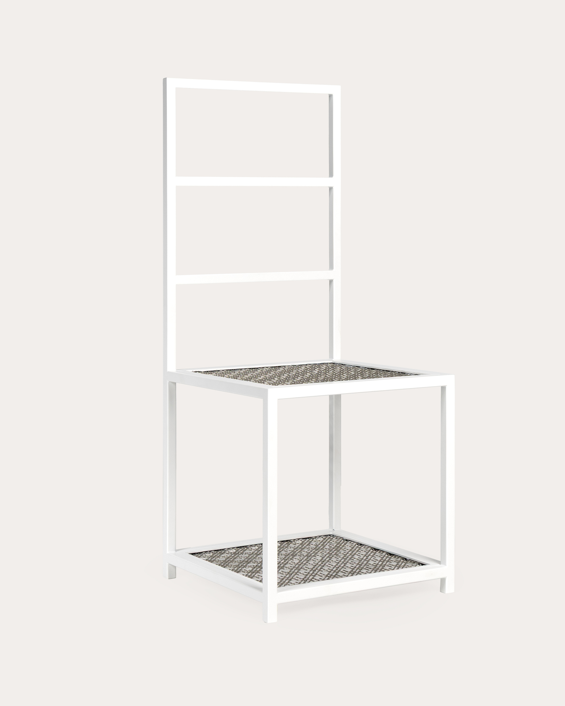 La chaise Towel Caddy adopte un dessin structuré, construit autour d’un cadre orthogonal aux proportions étirées. L’alternance entre structure et vide donne à la pièce une présence légère et graphique. Le métal thermolaqué blanc associé à l’inox souligne la netteté du profil et la clarté de la silhouette.