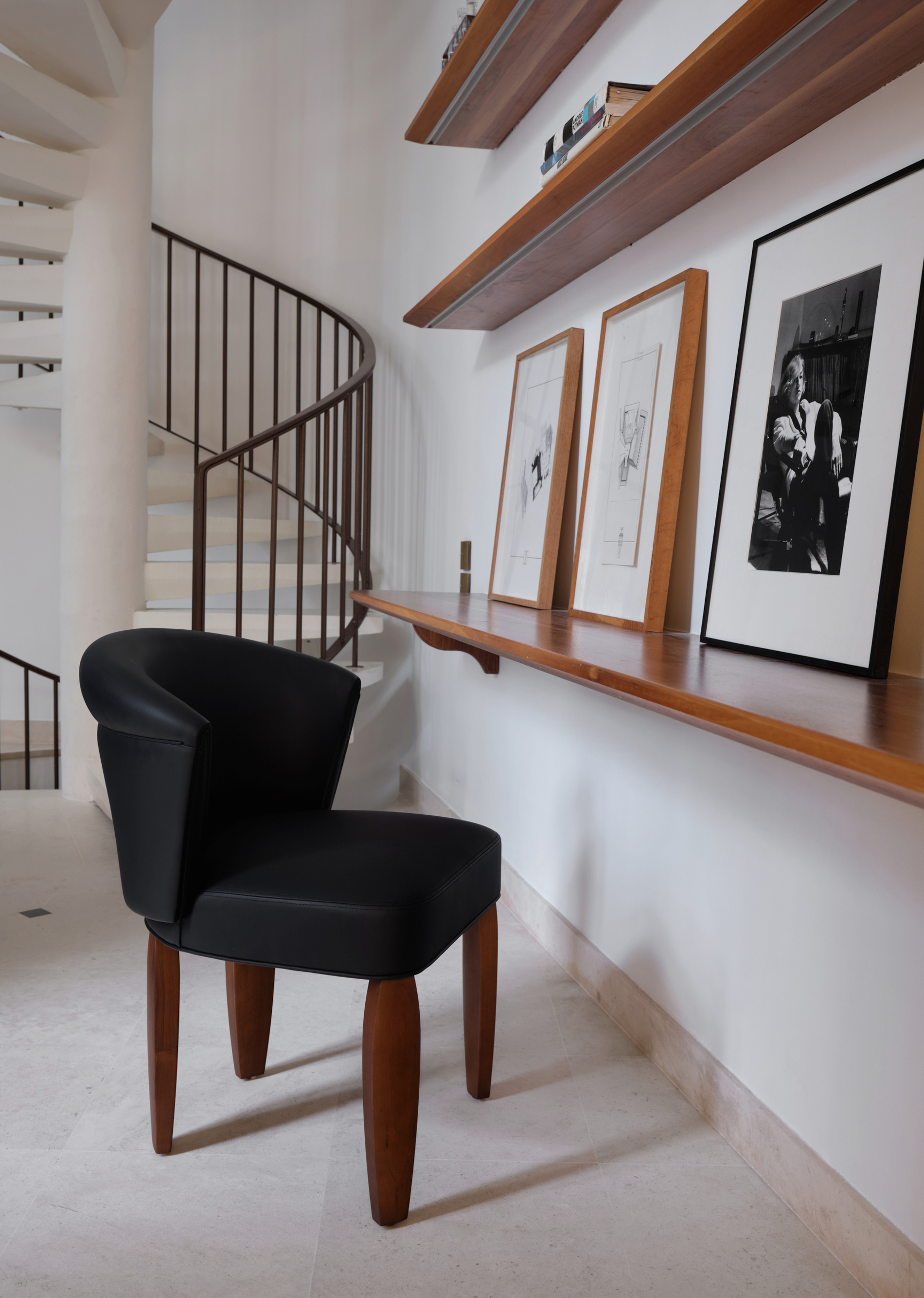 La chaise à Bras Ouverts conjugue une silhouette douce et enveloppante avec la verticalité élégante de ses pieds fuselés en noyer massif. Son dossier arrondi offre un confort naturel tout en préservant une grande liberté de mouvement.