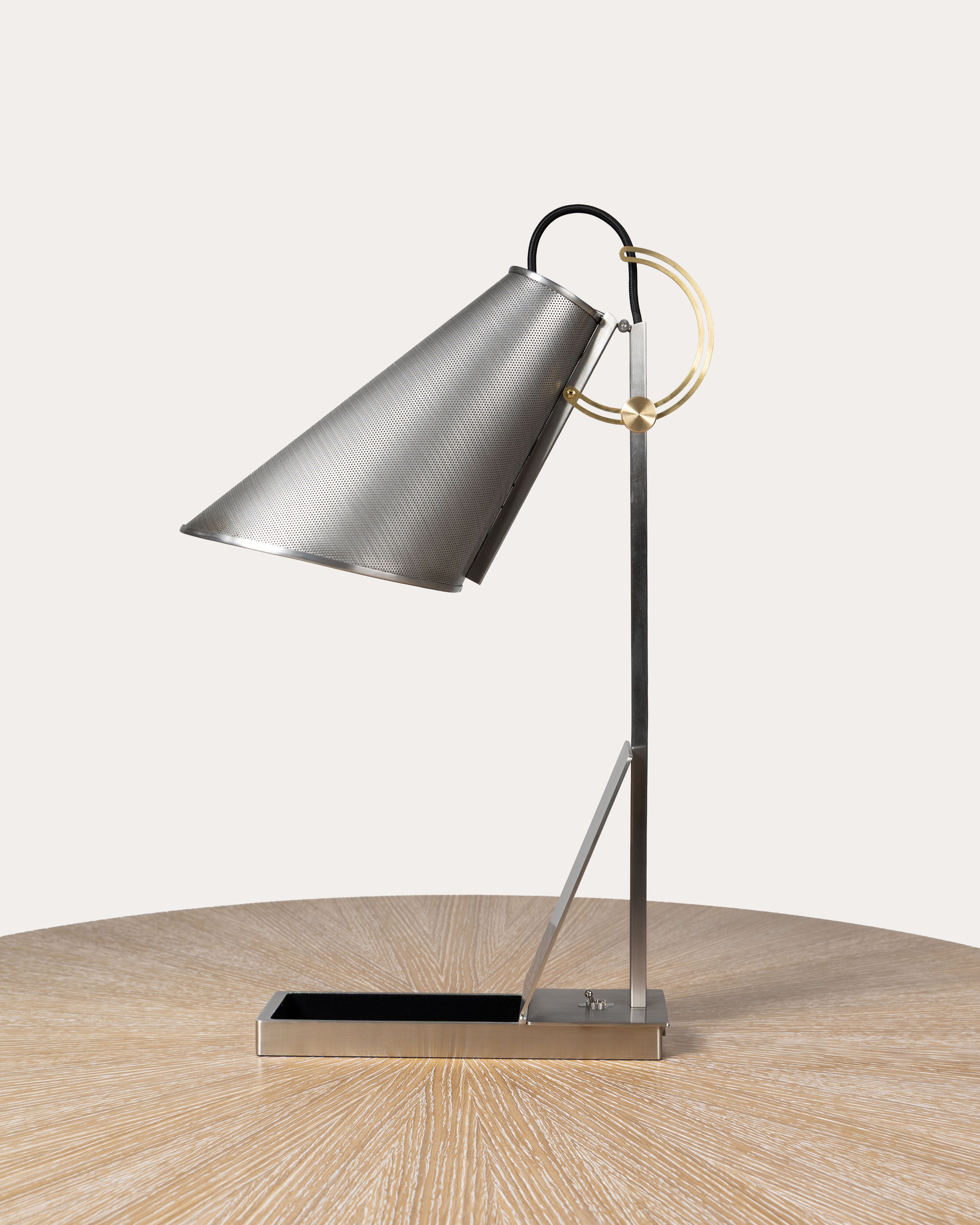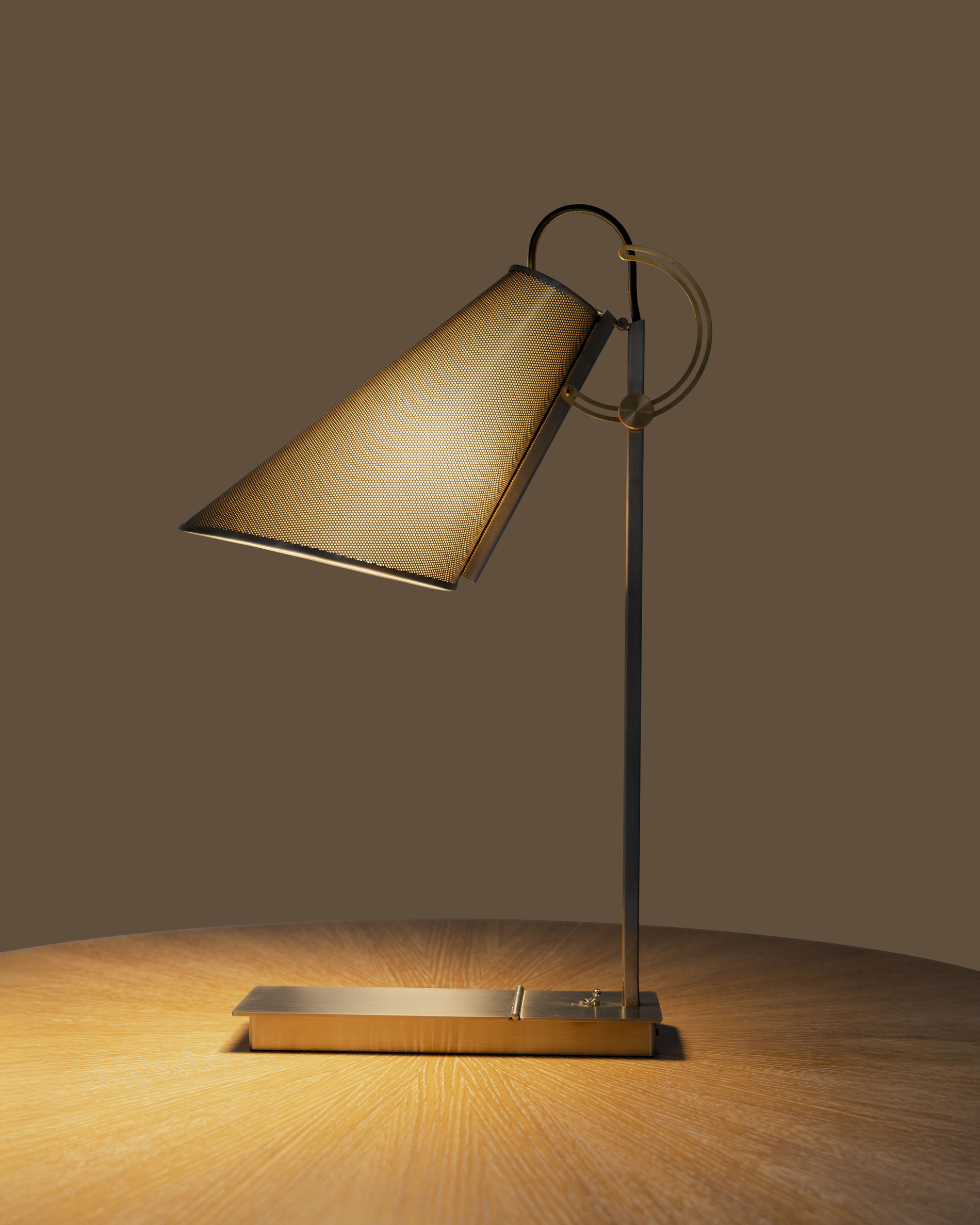 Les luminaires Compas dans l’œil s'appuient sur un dessin d’une grande clarté, où des formes géométriques simples se combinent avec justesse. L’inox brossé, le laiton satiné et la grille métallique perforée composent une silhouette harmonieuse, tandis que l’abat-jour pivotant permet d’orienter la lumière avec finesse.