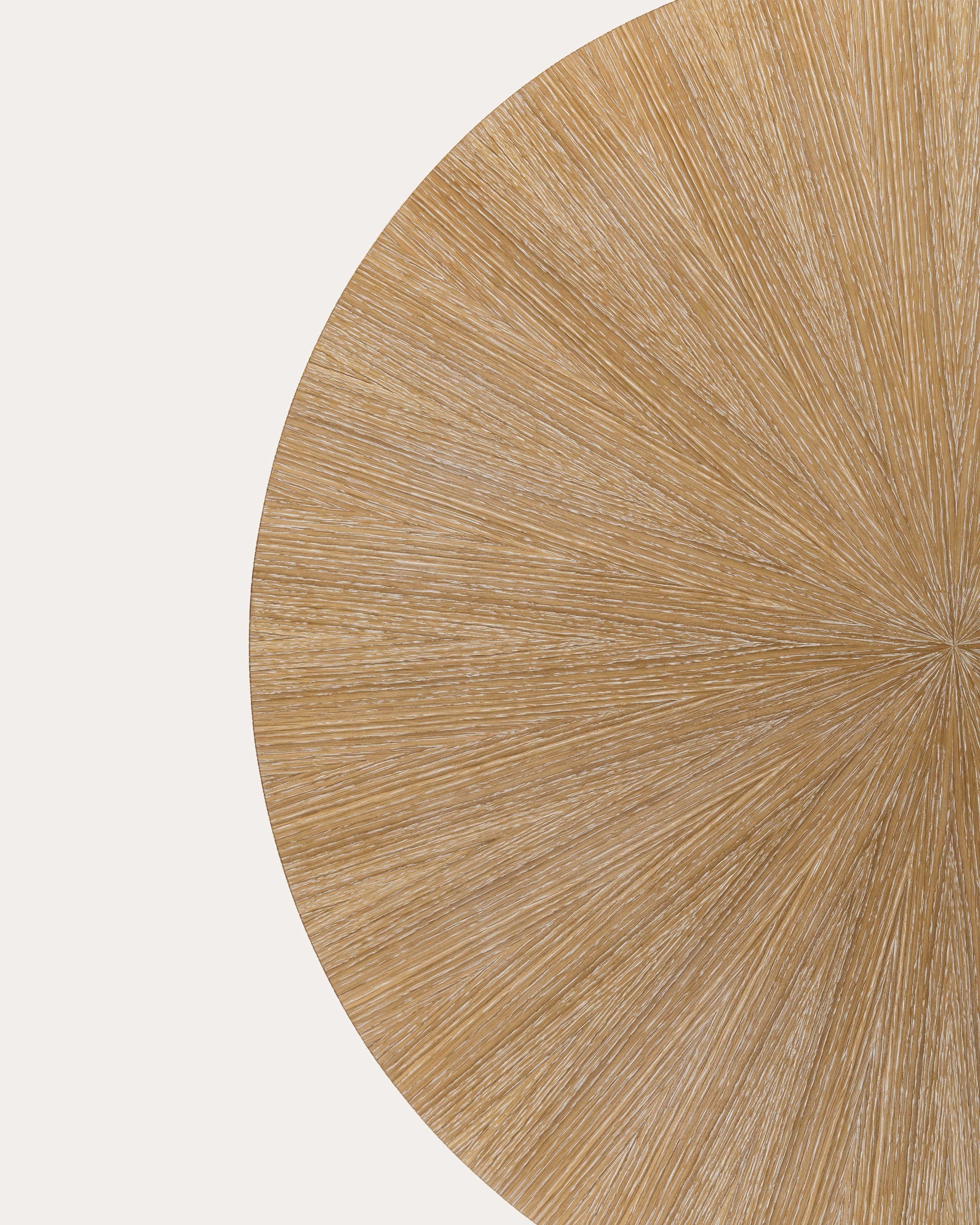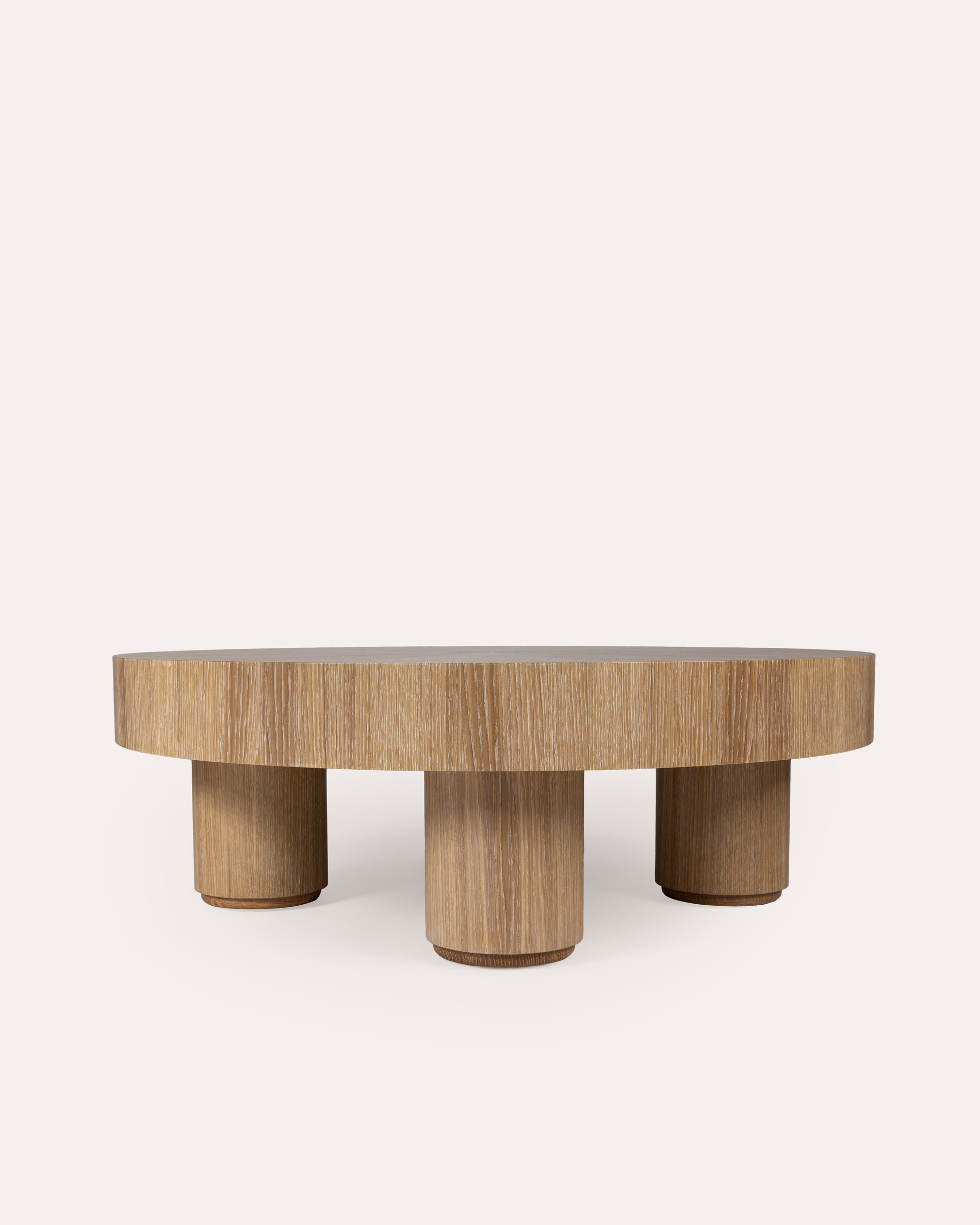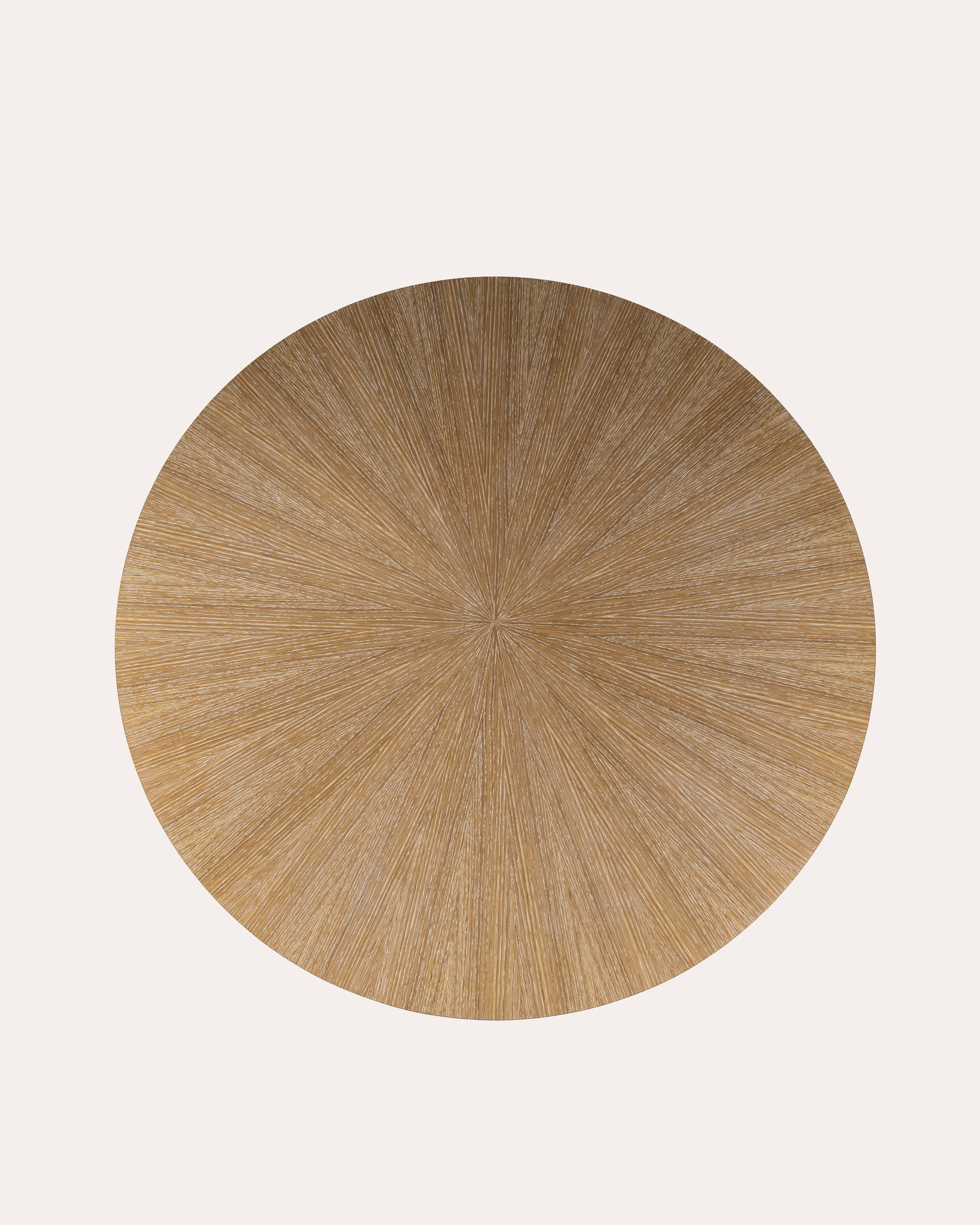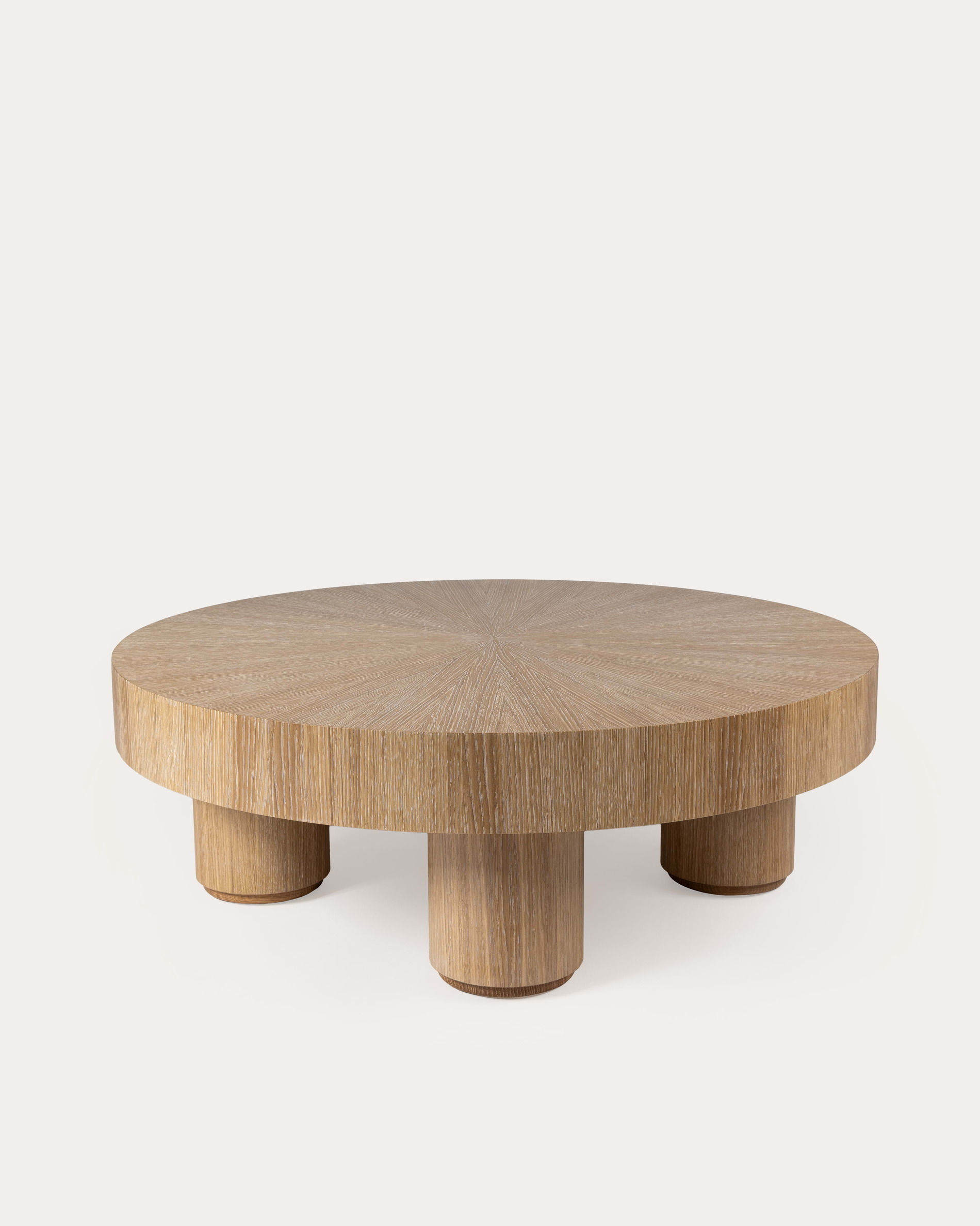 La table basse Jeune Bûcheron associe un large plateau circulaire à quatre fûts cylindriques qui lui confèrent une présence sculpturale affirmée. Le placage de chêne cérusé blanc déploie un motif rayonnant qui anime la surface d’une lumière douce. Une pièce où la clarté du dessin rencontre la richesse de la matière.