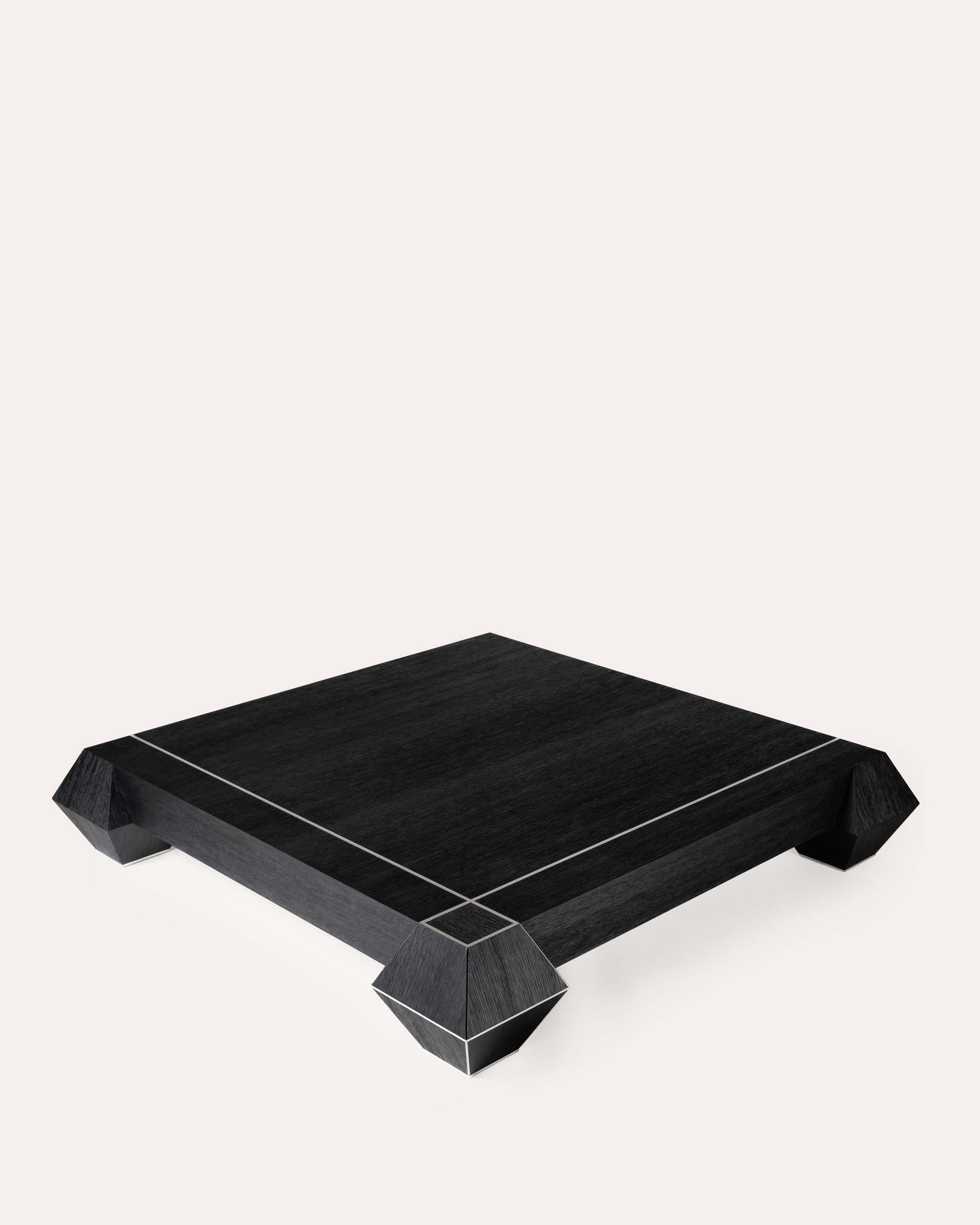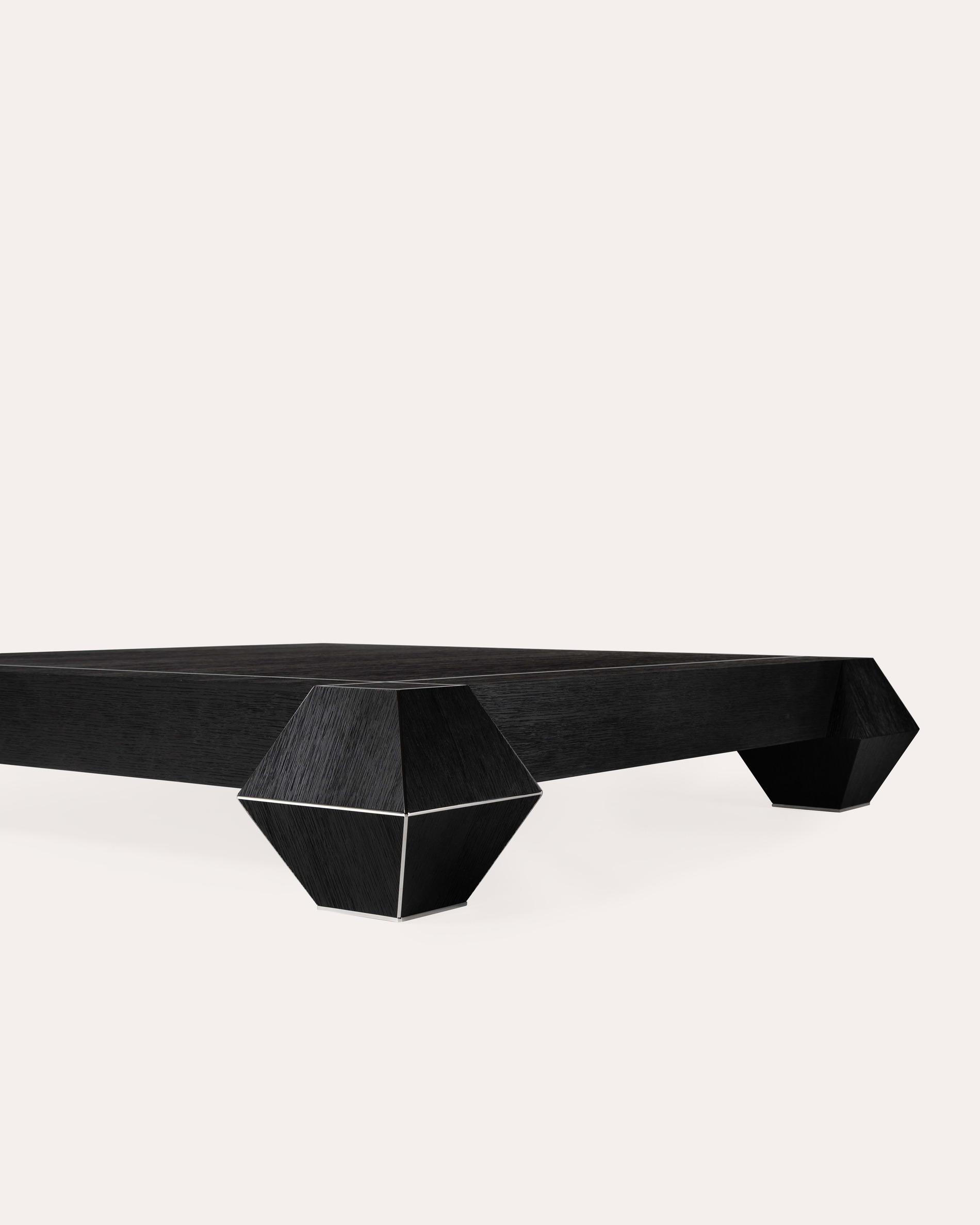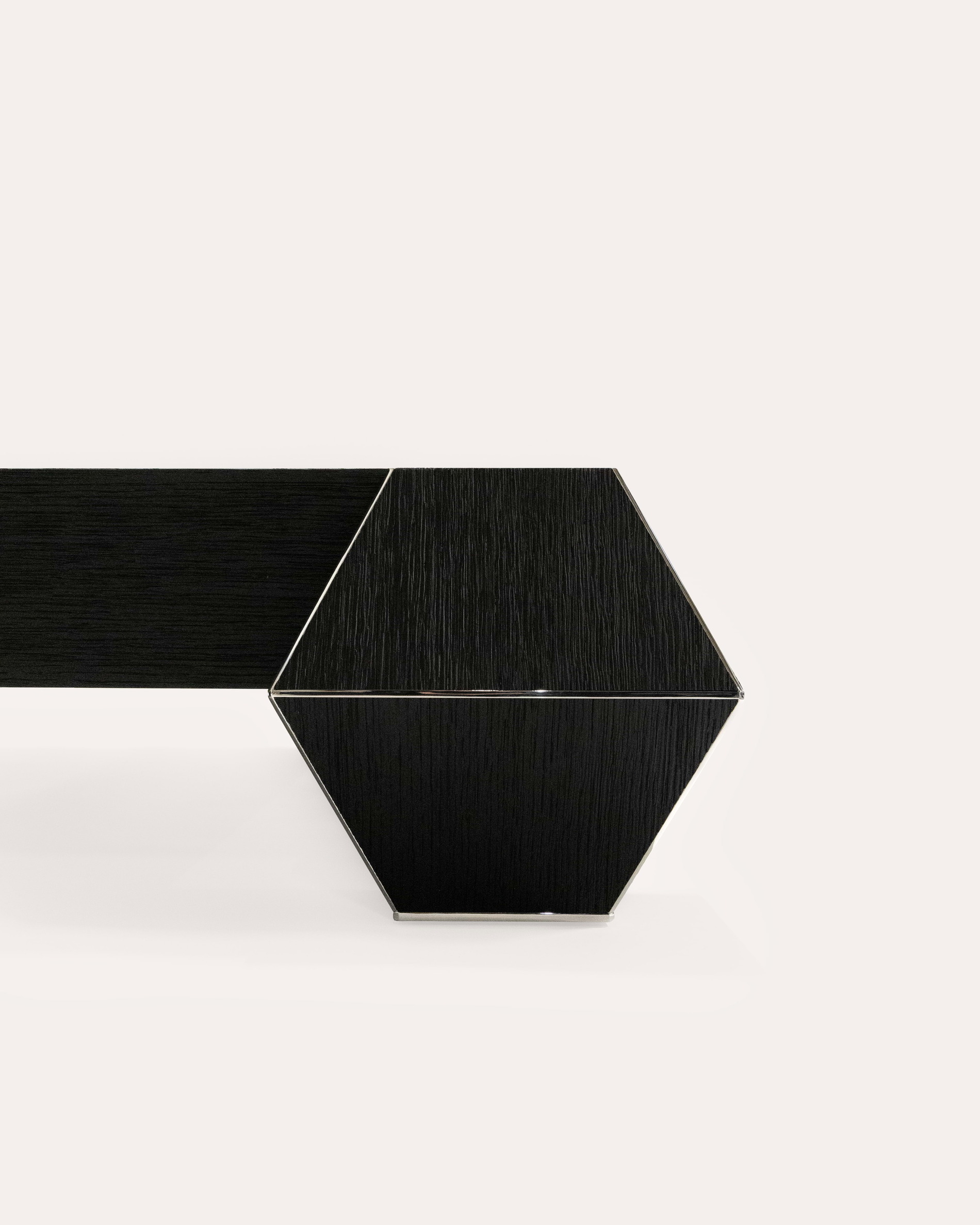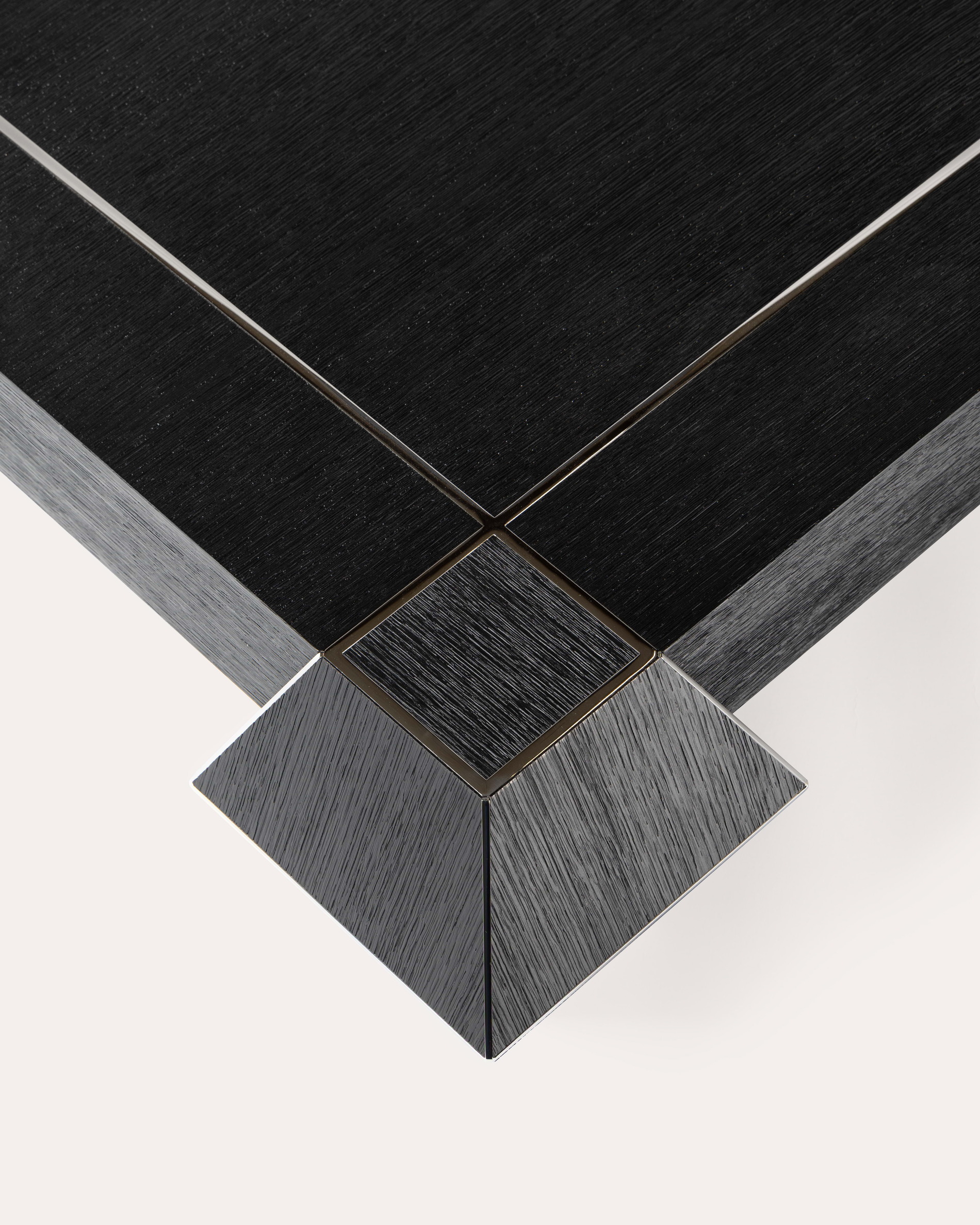 Cette version de la table Trois Carats joue sur le contraste entre le chêne noir brossé et les inserts en inox poli qui soulignent chaque arête. Le plateau, porté par quatre volumes facettés, révèle un dessin géométrique d’une grande netteté. Cette alternance de matières crée une pièce sculpturale où la profondeur du bois dialogue avec l’éclat du métal.