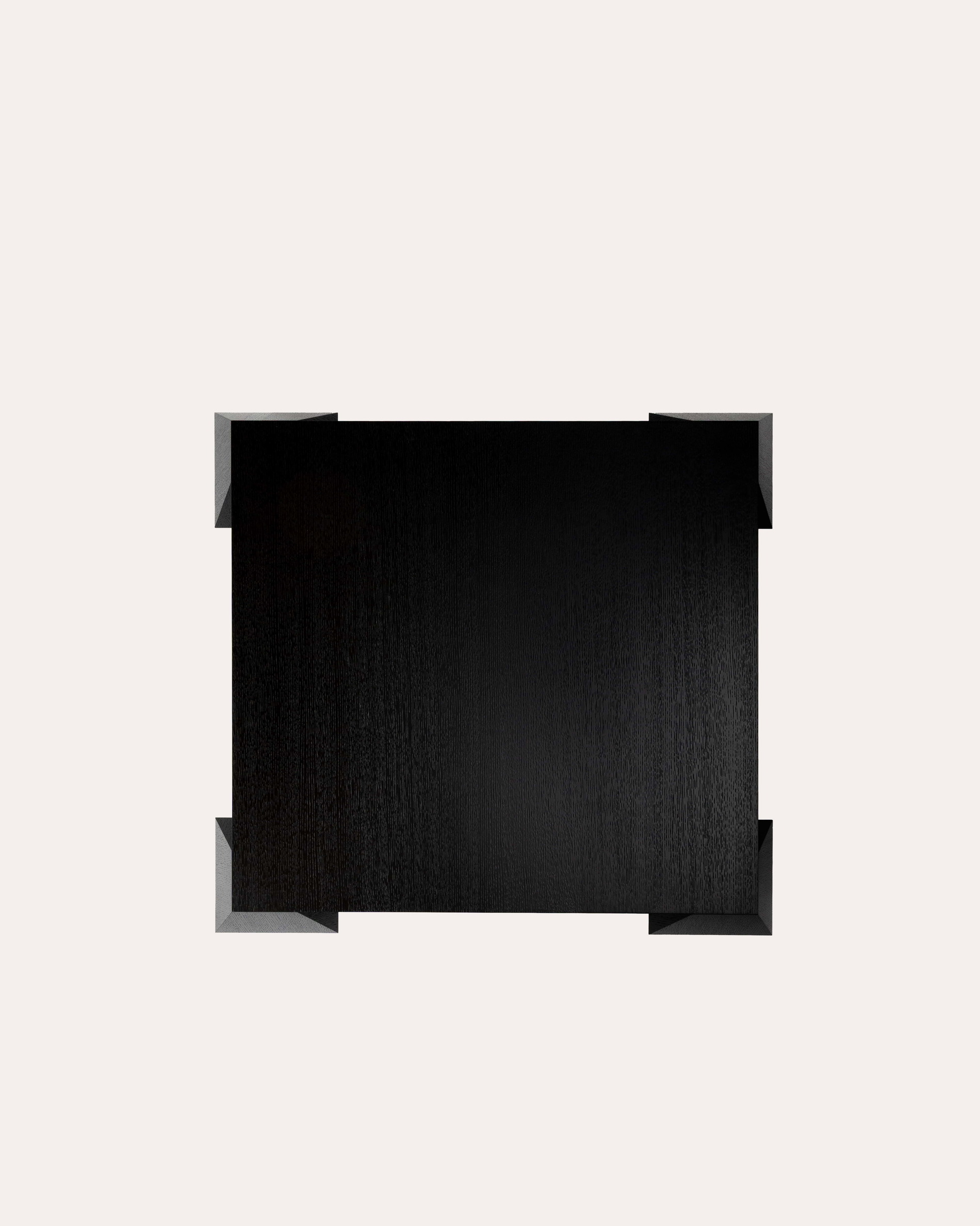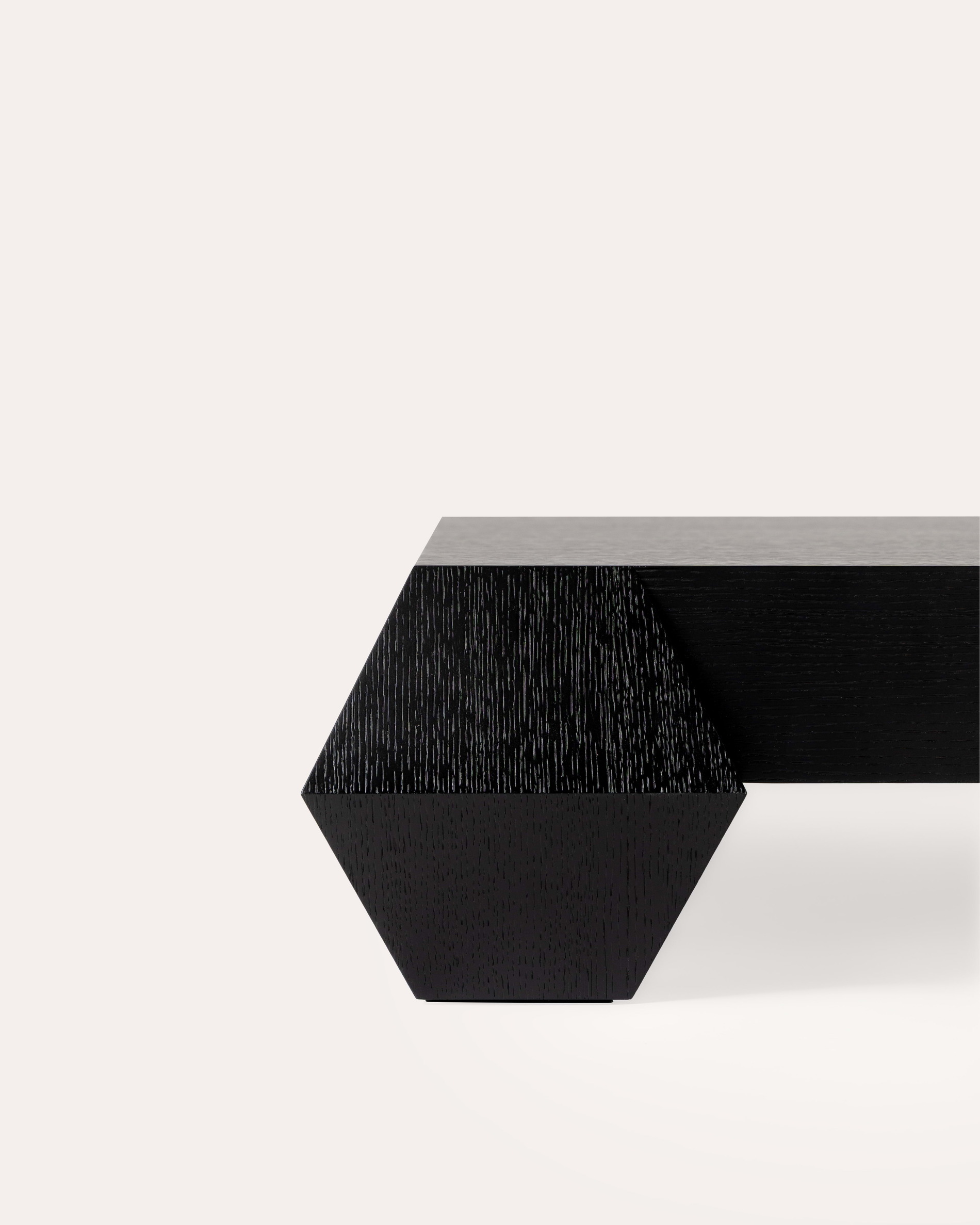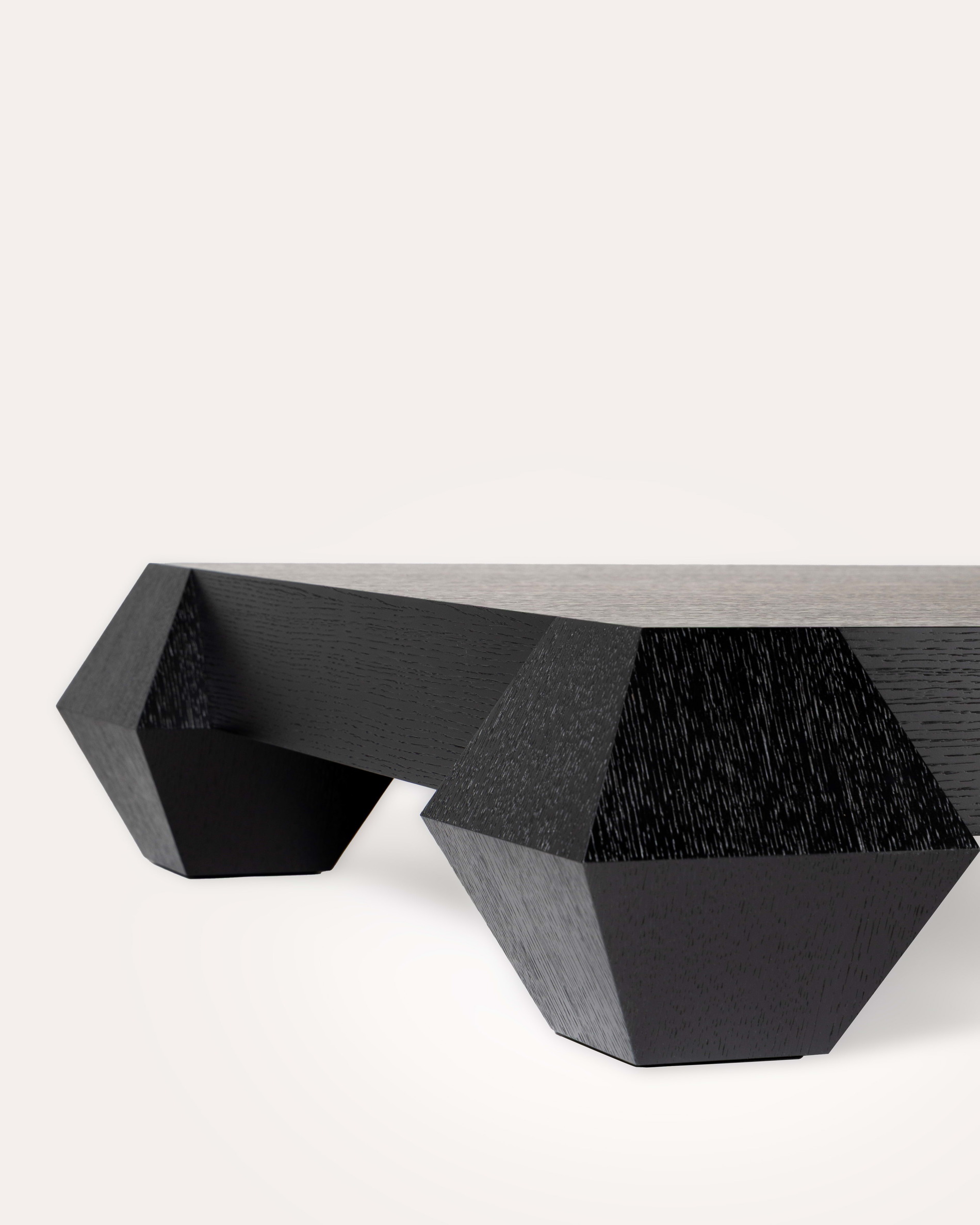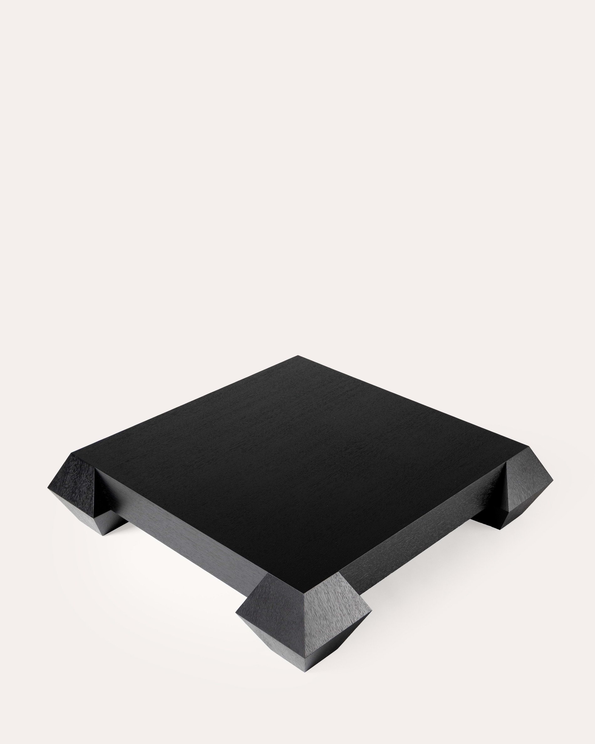 La table basse 3 Carat et Demi se compose d’un large plateau soutenu par quatre volumes facettés qui lui confèrent une présence sculpturale marquée. Une pièce aux lignes affirmées, où le dessin géométrique rencontre la densité de la matière.