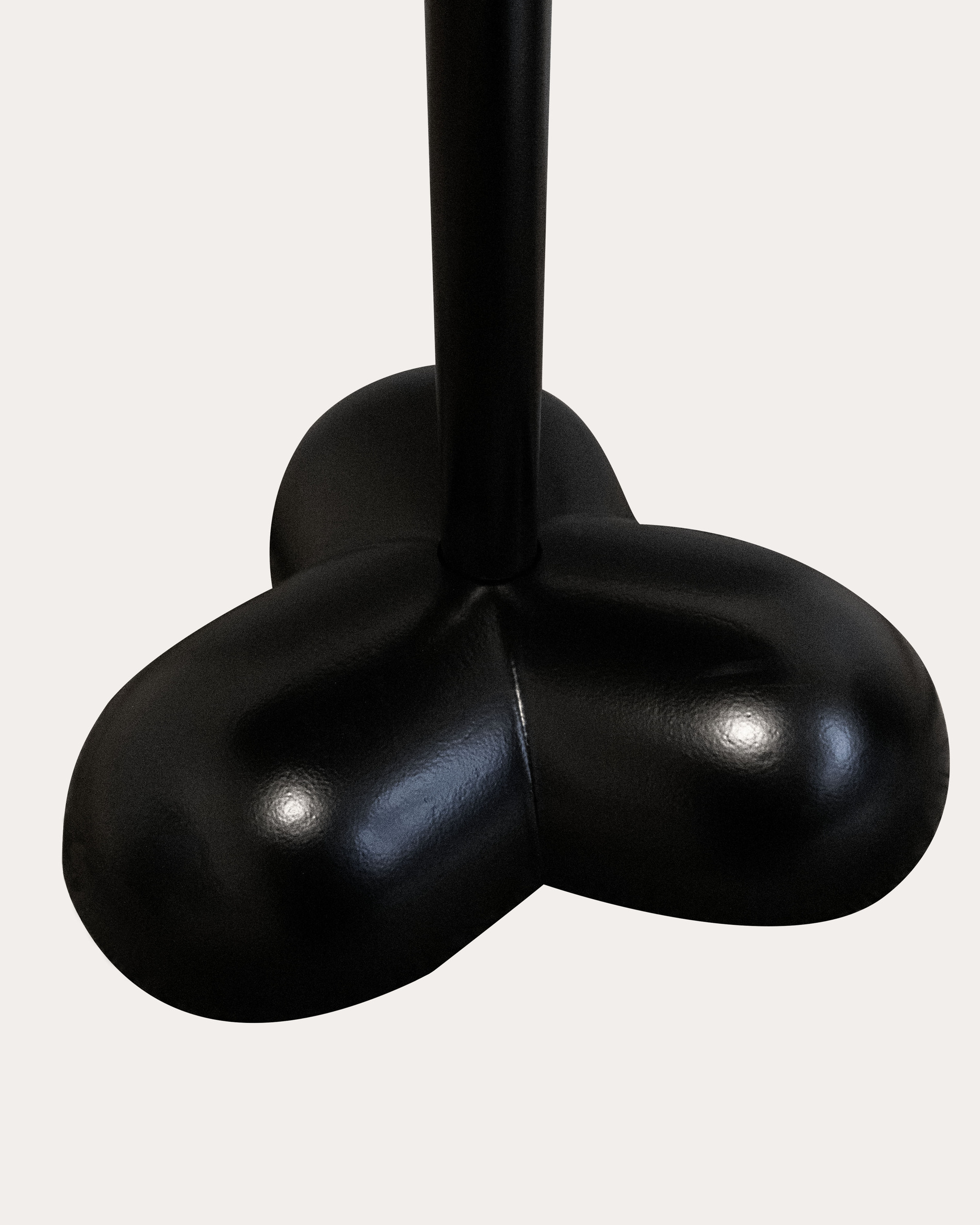 La table Trèfle repose sur un piètement sculptural composé de trois volumes arrondis qui lui confèrent une présence douce et singulière. Dans cette version, le métal thermolaqué noir dialogue avec un plateau en pierre lundhs emerald, dont les cristaux diffusent une lumière bleutée.