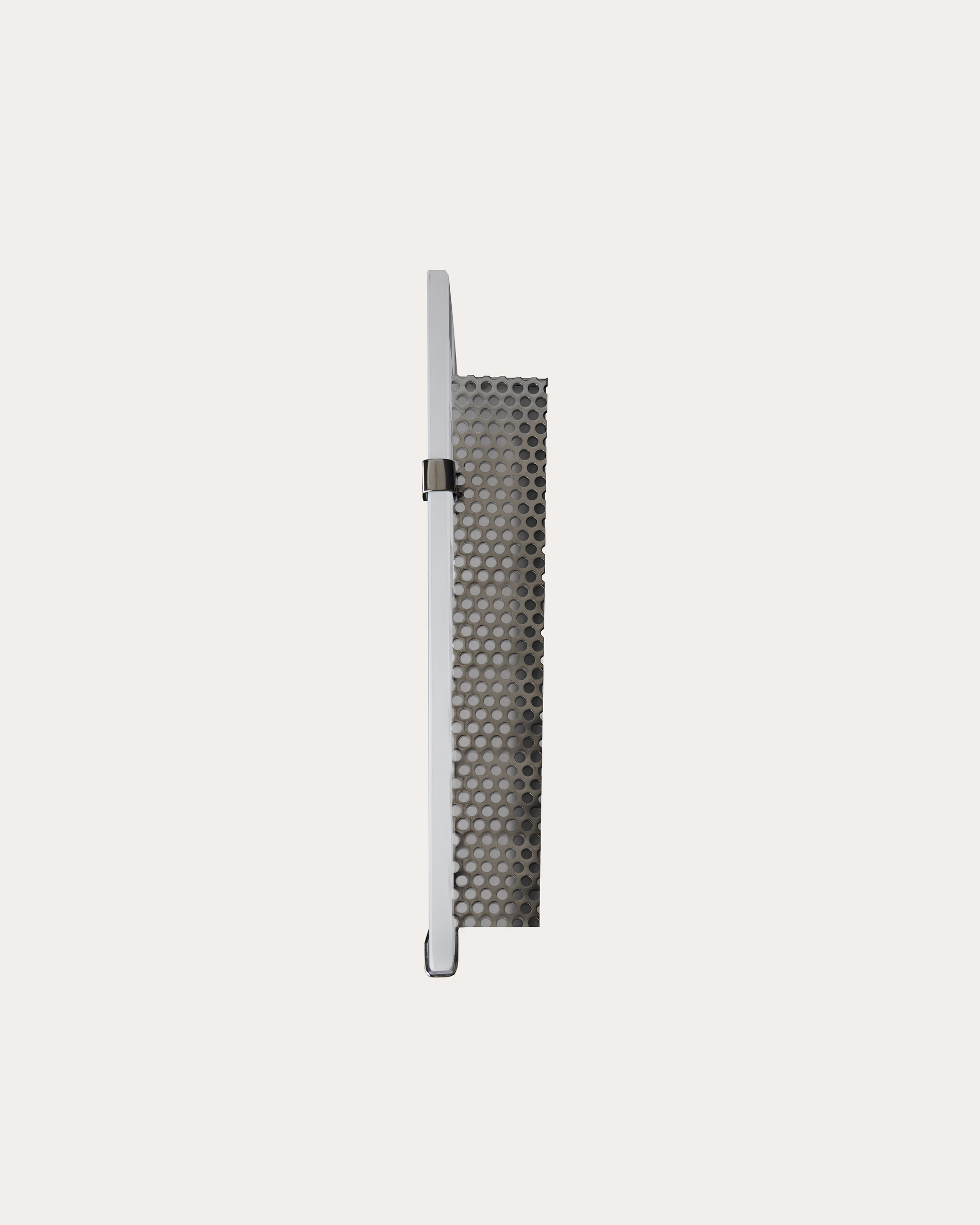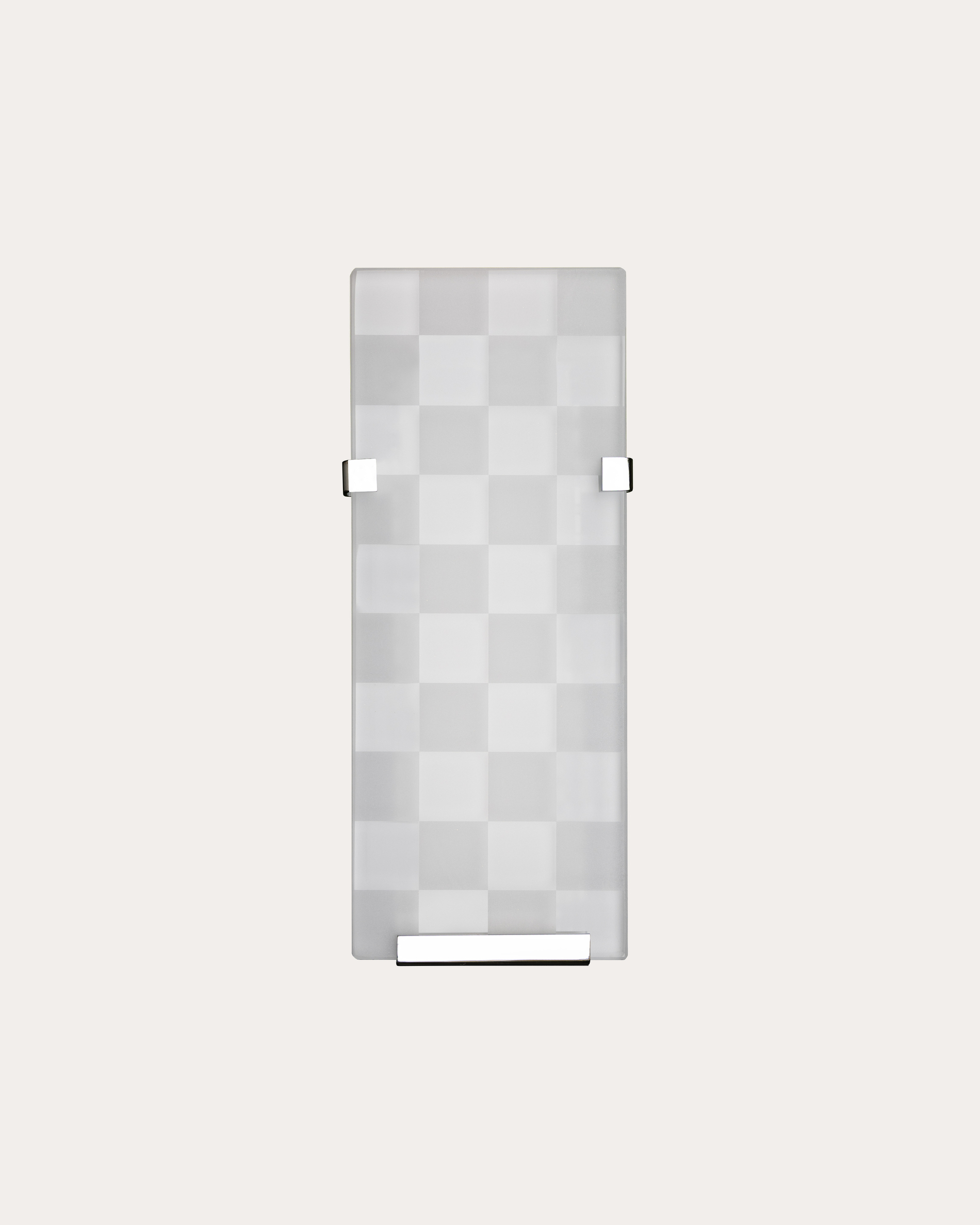verre sablé à motif à carreaux, laiton chromé et grille métal perforée